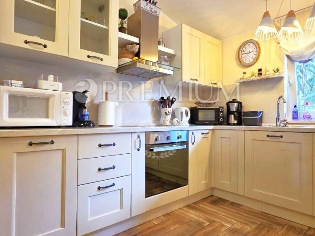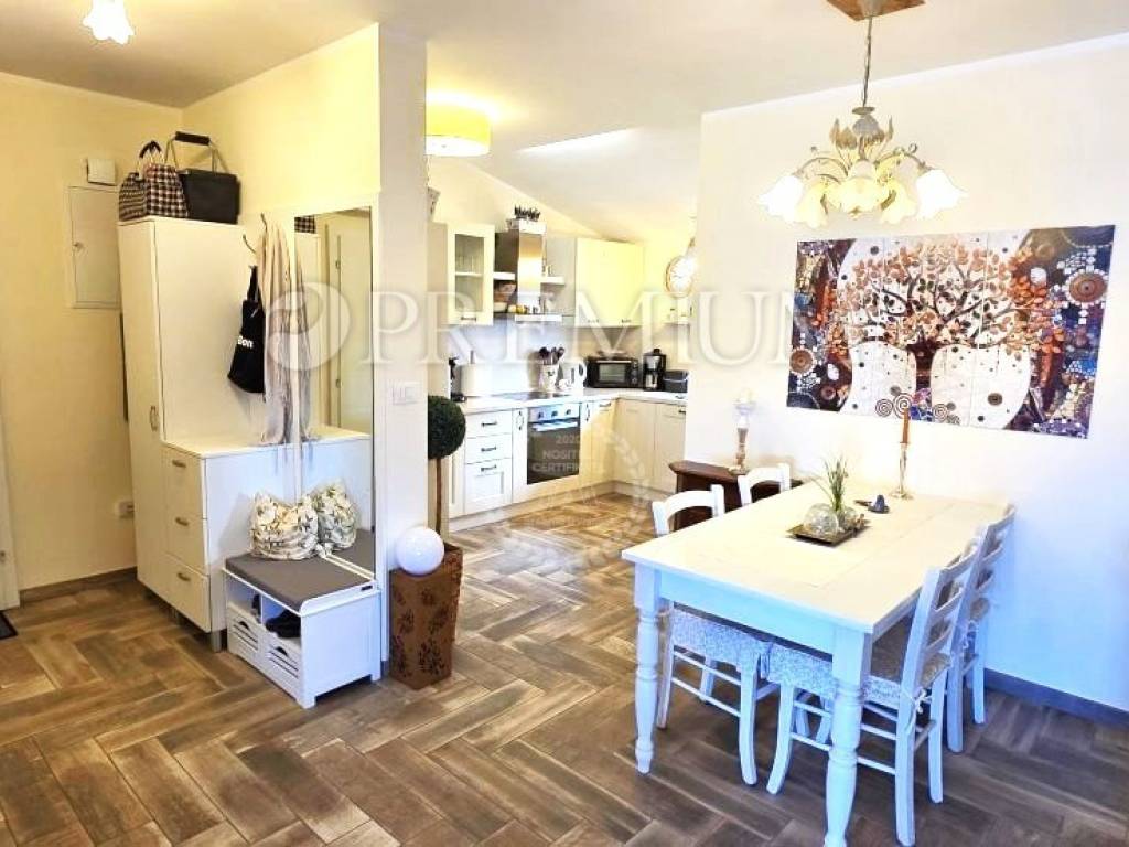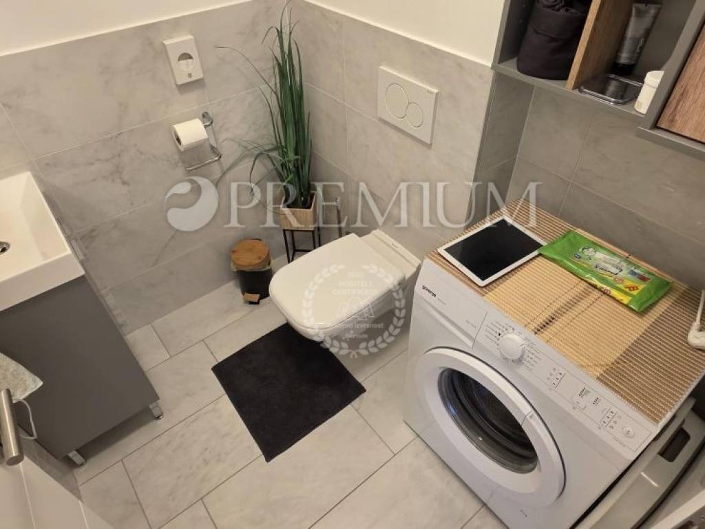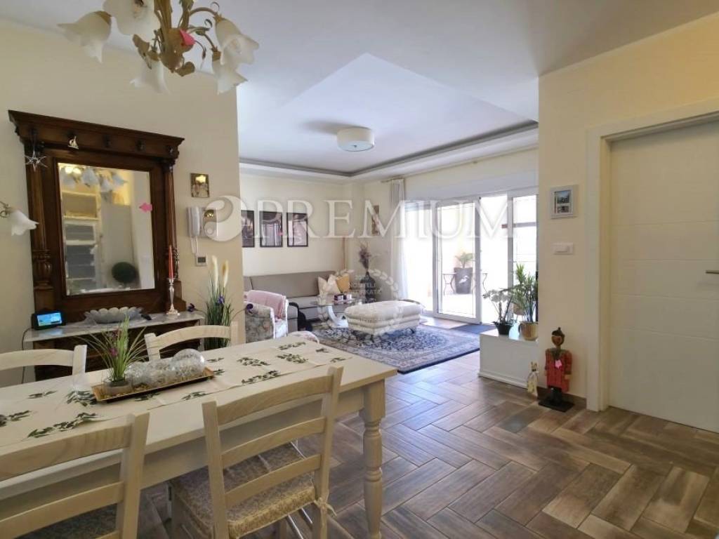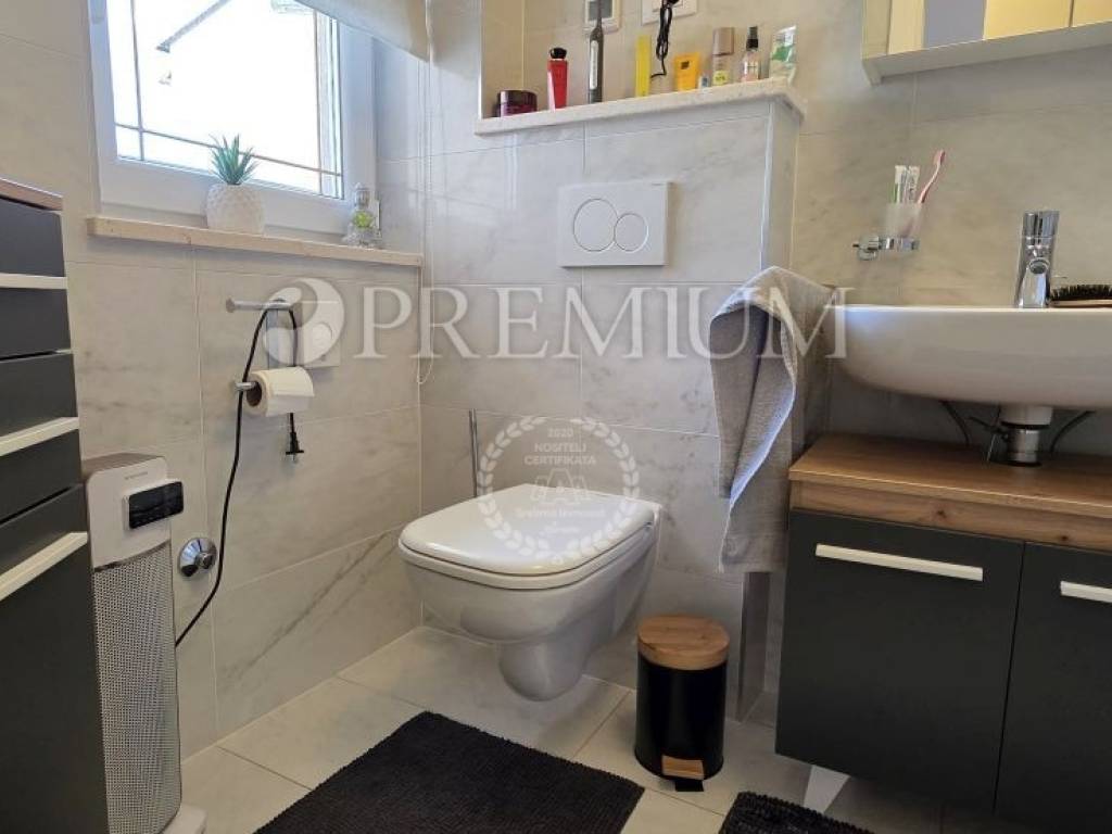 Apartman na drugom katu zgrade građene 2013. godine, s ukupno 6 stambenih jedinica, sastoji se od ulaznog prostora, gostinjskog toaleta, dvije spavaće sobe, svaka sa vlastitom kupaonicom, kuhinje s blagovaonom i dnevnog boravka, s izlazom na terasu s lijepim pogledom na more.
