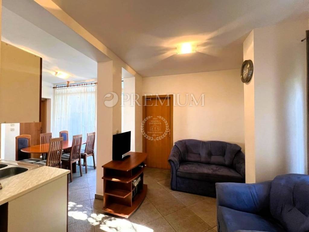 Apartman na prvom katu, ukupne površine 49 m², smješten je na mirnoj lokaciji, okružen zelenilom i tik uz rub građevinske zone, 450 m od plaže.