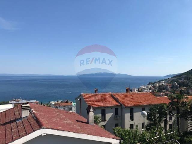 Na prvom katu je također trosoban stan sa dnevnim boravkom, kuhinjom, hodnikom i kupaonom te velikom osunčanom terasom sa koje se pruža pogled na cijelu Opatiju.
