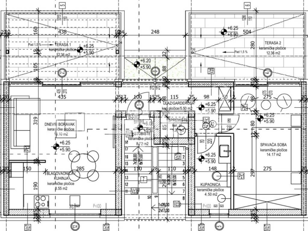 Dnevna zona s kuhinjom i blagovaonicom otvara se prema dvjema prostranim terasama koje stvaraju prirodan produžetak interijera i nude prostor za opuštanje, objedovanje ili stvaranje vlastitog zelenog kutka.