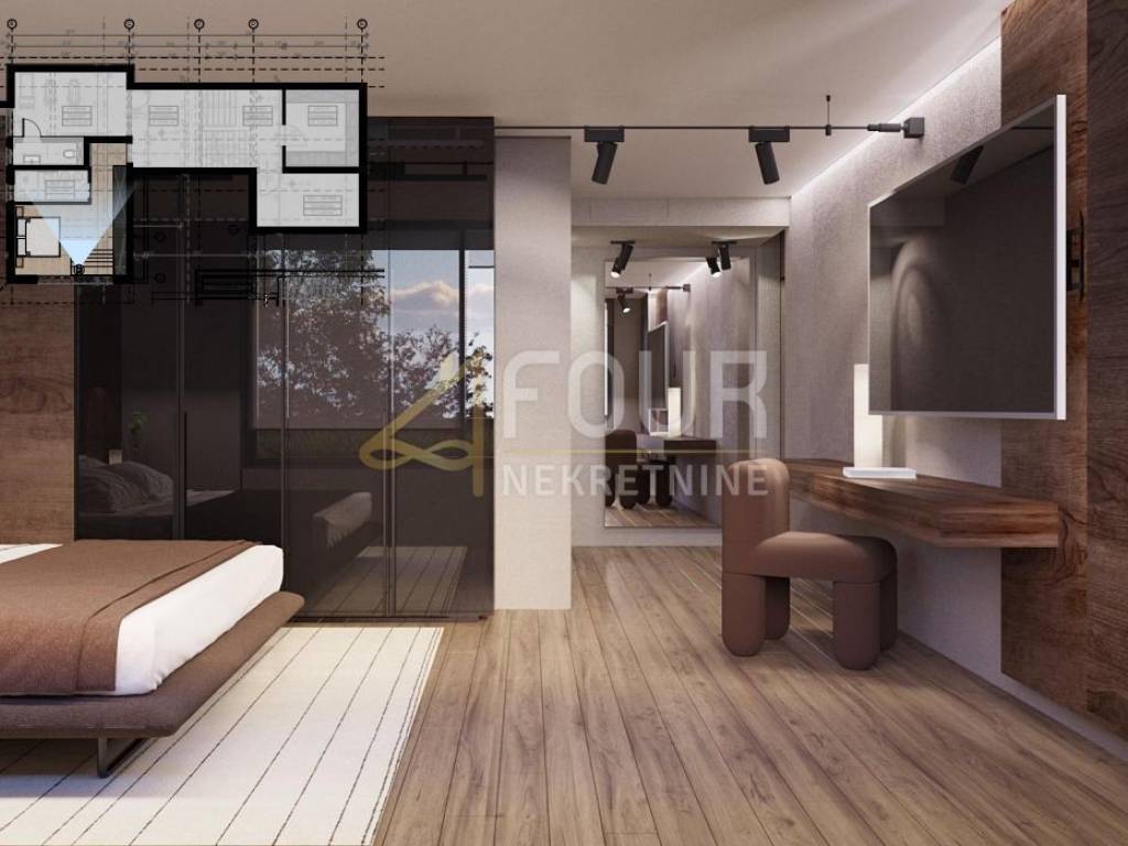 U suterenu se nalaze dnevni boravak s kuhinjom i blagovaonicom, prostor za opuštanje s fitnessom, saunom i vinskim ormarom, te izlaz na terasu s grijanim bazenom. Prizemlje obuhvaća dvije spavaće sobe s vlastitim kupaonicama, dok su na katu još dvije spavaće sobe s kupaonicama i privatnim terasama s pogledom na more.