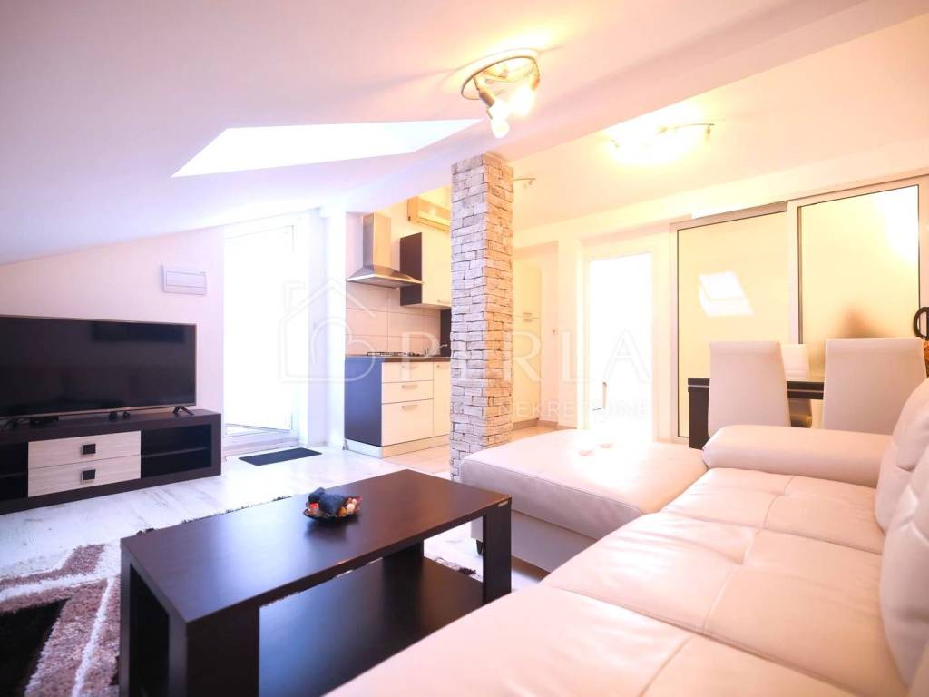 Stambeni prostor na 1. katu započinje lijepo raspoređenim namještenim dnevnim  boravkom s kuhinjom i blagovaonicom.