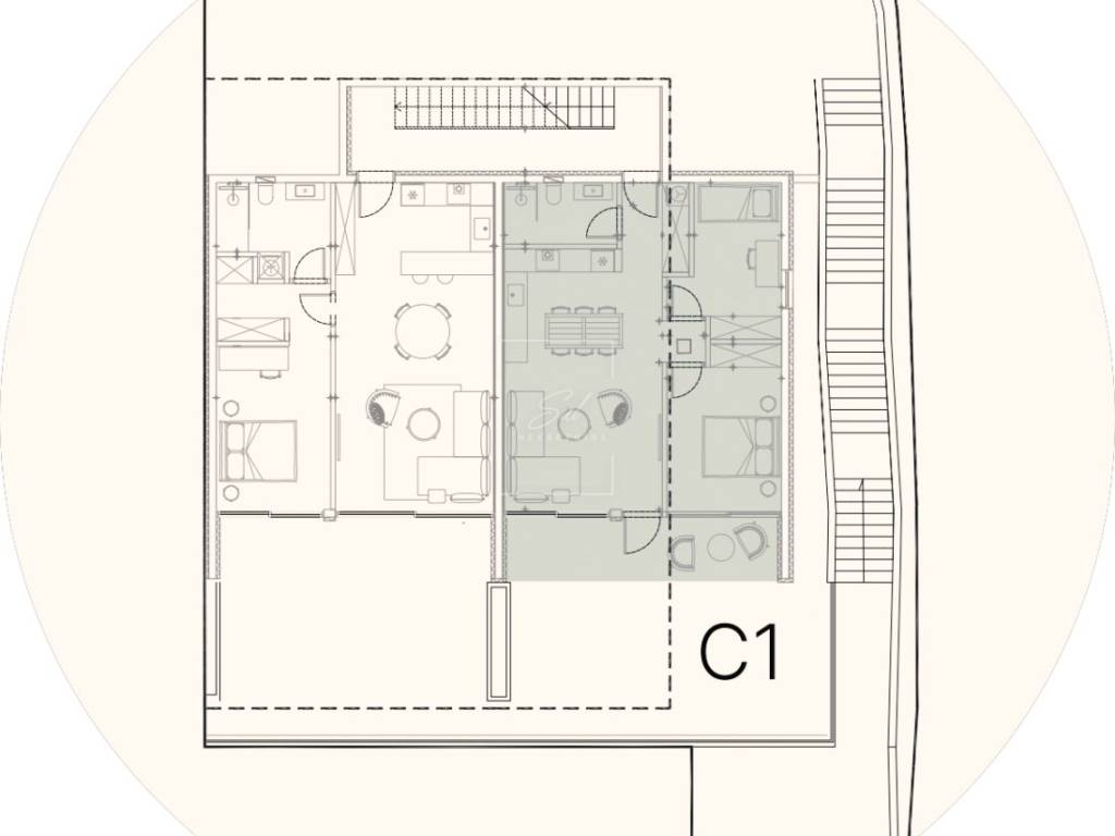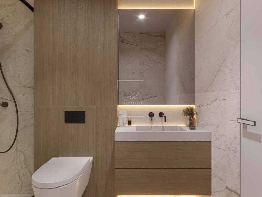Iz dnevnog boravka izlazi se na terasu (9 m² s uračunatim koeficijentom) te u uređeni vrt površine 57 m². Stanu pripadaju i dva parkirna mjesta u garaži, što dodatno doprinosi komforu i sigurnosti.