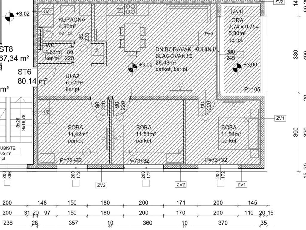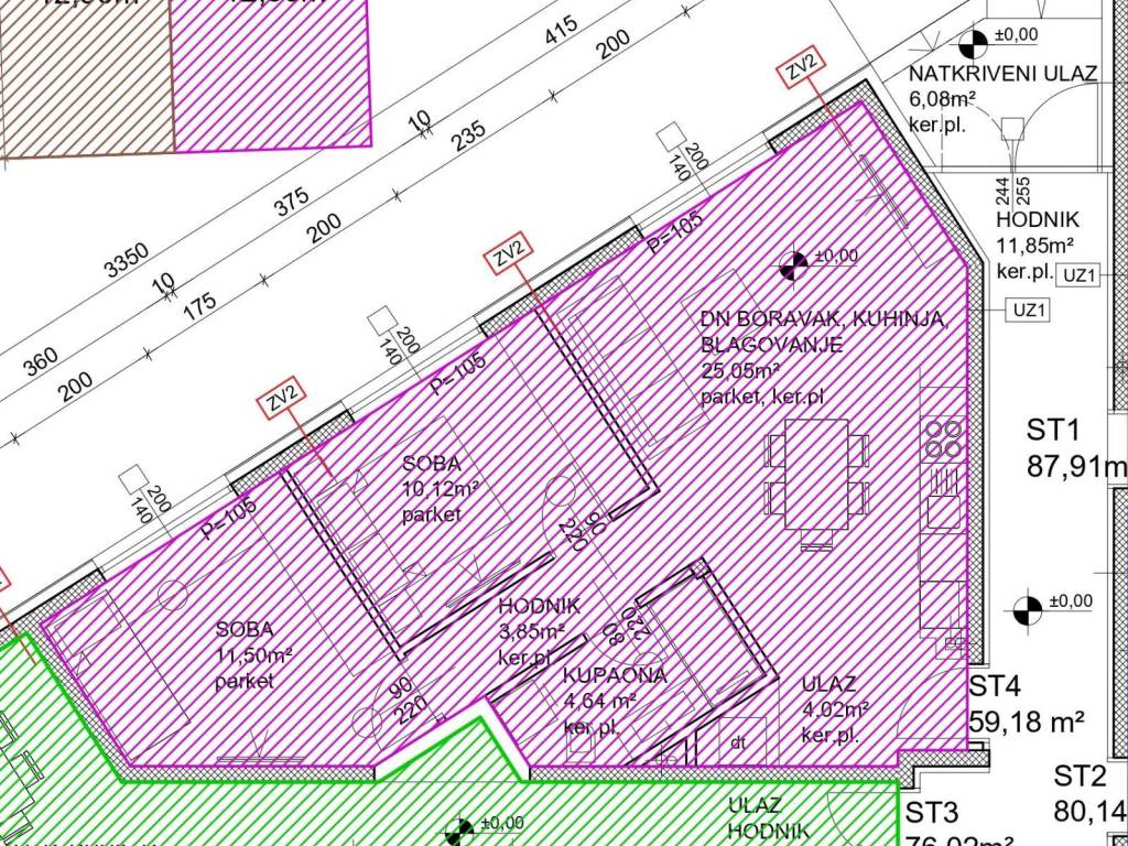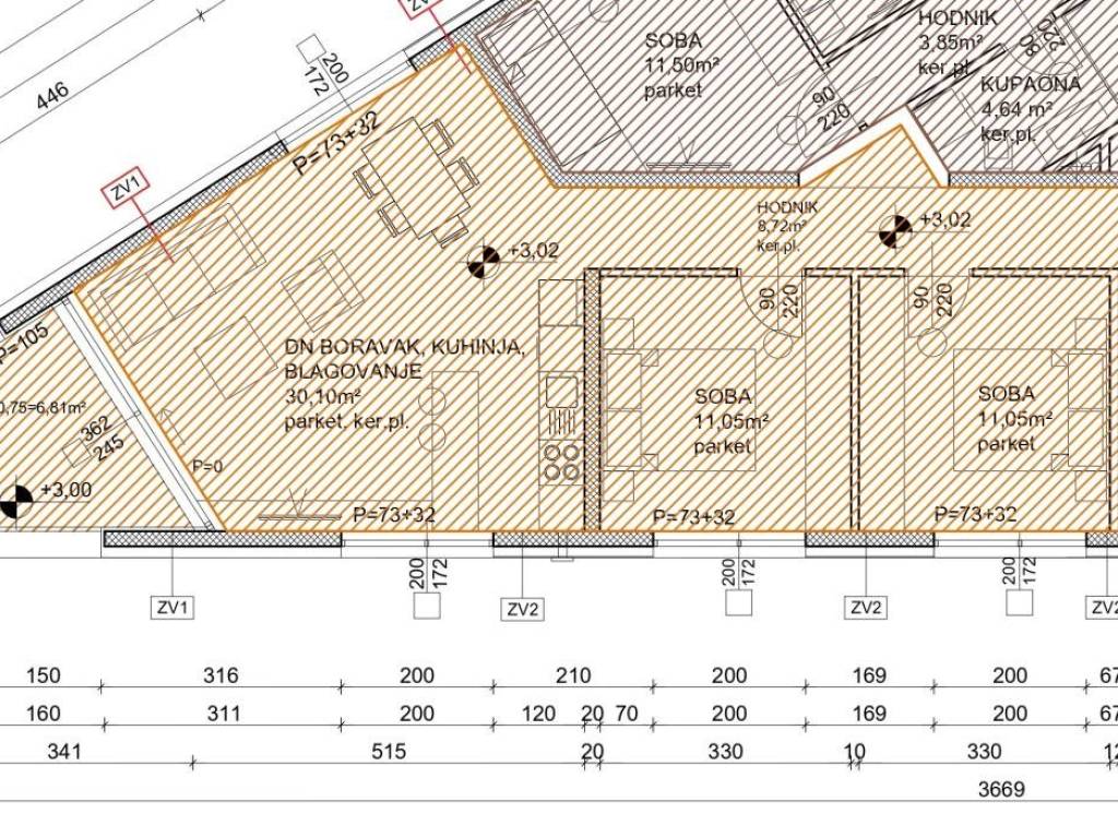3. Trosobni stan u prizemlju oznake ST3, podne površine 71,12 m², koji se sastoji od ulaza, hodnika, kupaone, dnevnog boravka, blagovaonice i kuhinje i dvije sobe s lođom u prizemlju podne površine 6,54 m², kojem pripada parkirno mjesto oznake PM7 u prizemlju podne površine 12,50 m² i parkirno mjesto oznake PM8 u prizemlju podne površine 12,50 m²