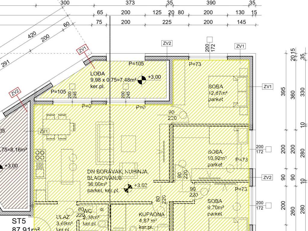 5. Četverosobi stan na katu oznake ST5, podne površine 80,43 m², koji se sastoji od ulaza, kupaone, wc-a, dnevnog boravka, blagovaonice i kuhinje i tri sobe s lođom na katu podne površine 9,98 m², kojem pripada parkirno mjesto oznake PM12 u prizemlju podne površine 12,50 m² i parkirno mjesto oznake PM13 u prizemlju podne površine 12,50 m² ukupna površina sa koeficijentom = 94,17 m2