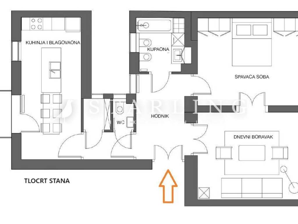 Stan se sastoji od dnevnog boravka, kuhinje s blagovaonicom, spavaće sobe, kupaonice, WC-a, hodnika, ostave i balkona.