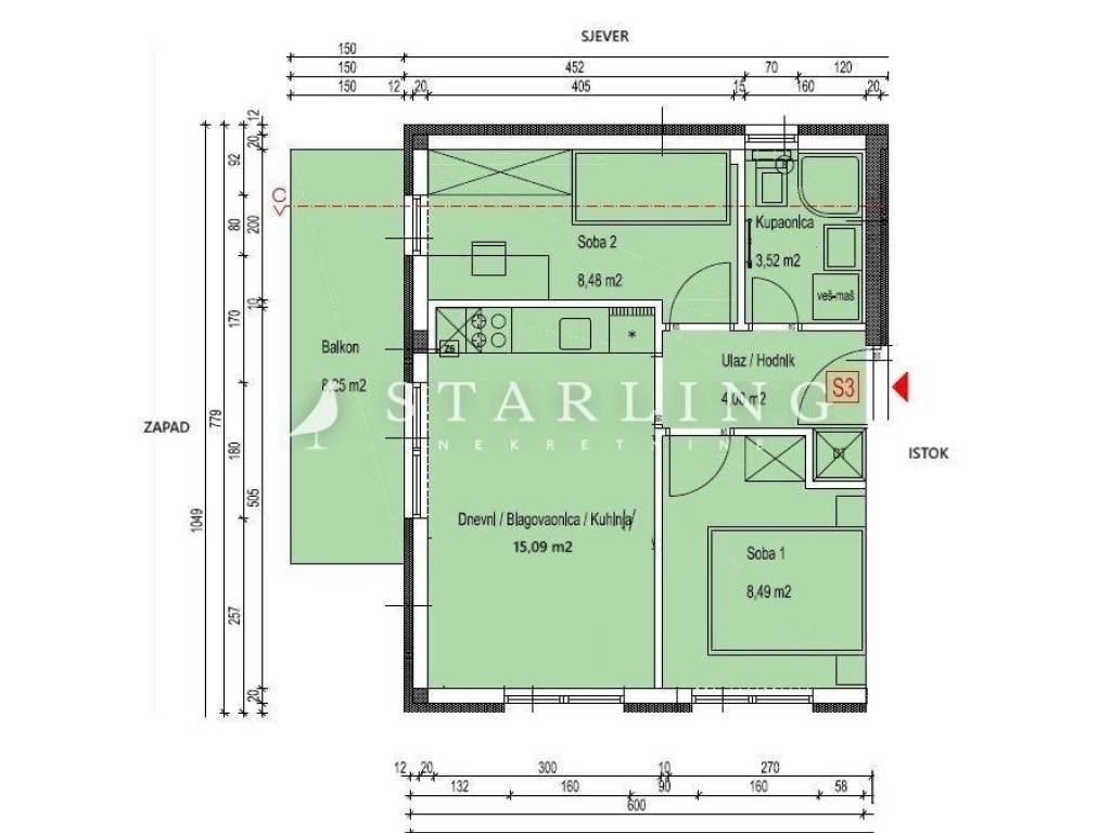 Stan S3 sastoji se od dnevnog boravka s kuhinjom i blagovaonicom, dvije spavaće sobe, hodnika, kupaonice s wc-om i balkona ukupne kvadrature 41,64 m2.
