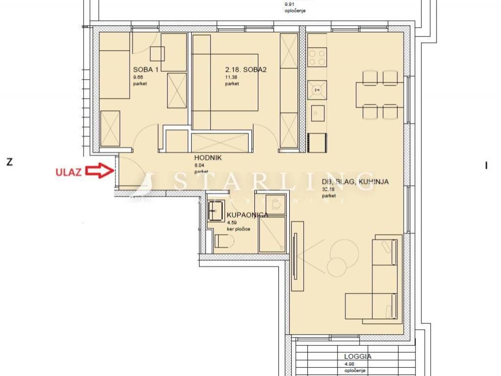 Stan se sastoji od open space dnevnog boravka s blagovaonicom i kuhinjom, dvije spavaće sobe, kupaonice s WC-om, hodnika, balkona i lođe.