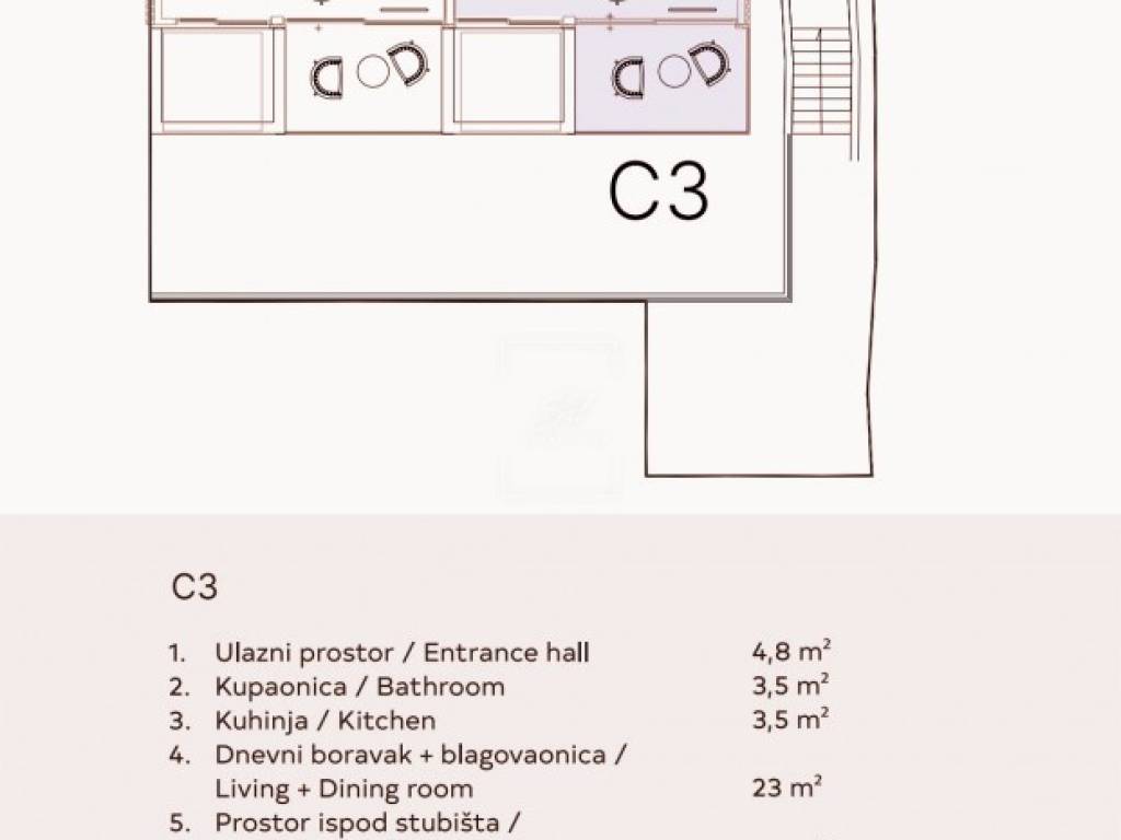Sastoji se od ulaznog prostora, kupaonice, spavaće sobe, kuhinje s blagovanjem, dnevnog boravka, prostora ispod stubišta, natkrivenog balkona i vrta. Prostor je odlično povezan s vanjskim dijelom, što pruža osjećaj prostranosti i privatnosti.