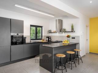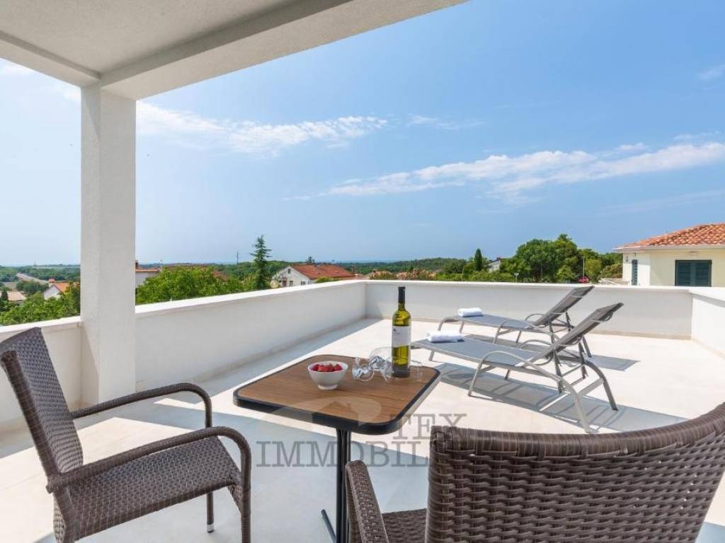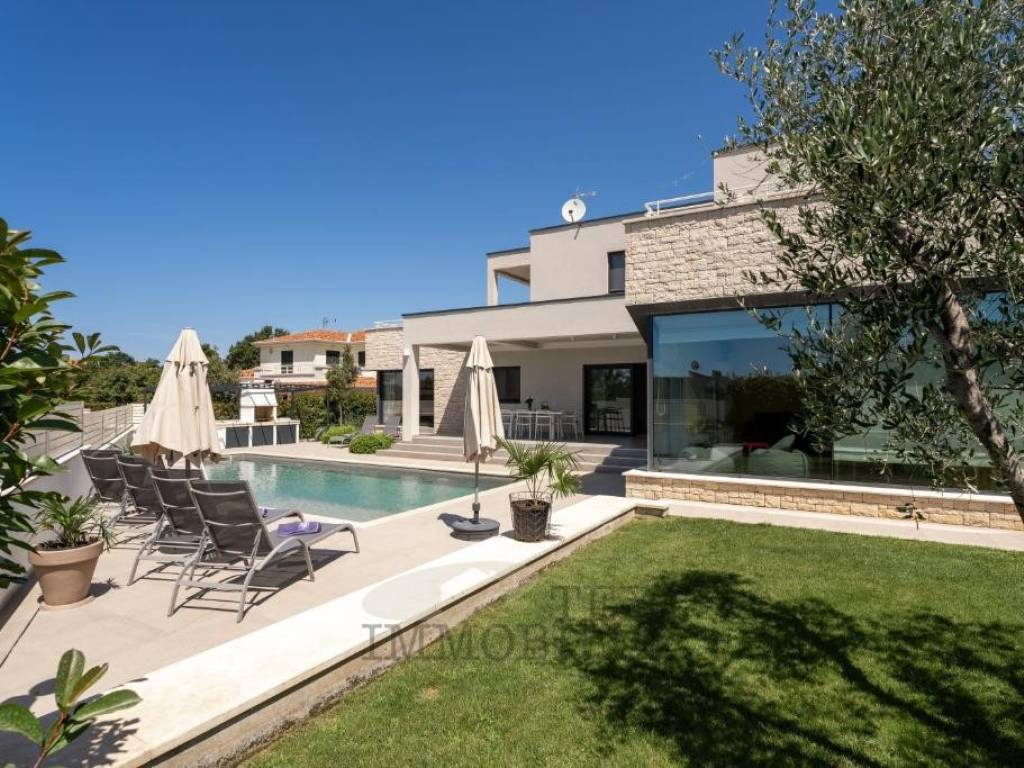 Ova prekrasna i moderna vila s pogledom na more smještena je na uzvisini na jednom brežuljku u neposrednoj blizini Poreča. Moderna arhitektura i suvremeni dizajn čine ovu vilu idealnom za život, ali i za najam. Kuća je otvorenog tlocrta, u prizemlju se nalazi moderna i dobro opremljena kuhinja u kojoj možete zadiviti obitelj i prijatelje pripremom ukusnih jela, tu je i blagovaonica i dnevni boravak u kojem se možete opustiti nakon napornog dana. Također, tu je i jedna prostrana spavaća soba s en-suite kupaonicom, gostinjski WC, ali i prostorija koja je trenutno namijenjena za prostor za dječju igru, kao i dvije ostave. Na katu kuće nalaze se tri spavaće sobe od kojih jedna ima garderobu; walk in ormar. Na katu se nalaze i dvije kupaonice, jedna s tušem, a druga s ležećom kadom. Svaka prostorija u kući opremljena klima uređajima. Kuća je spojena na gradski plin te ima centralno podno grijanje svih prostorija a u kupaonama su dodani i kupaonski radijatori. Kuća ima na krovu solarne panele za pripremu sanitarne vode. Svi prozori i balkonska vrata imaju električne rolete, dok balkonska vrata u dnevnom boravku imaju žaluzine. U dvorištu kuće nalazi se veliki bazen, natkrivena terasa i dječje igralište.