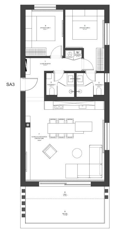 Ovaj dvosoban stan A3 nalazi se na 1. katu zgrade i sastoji se od: