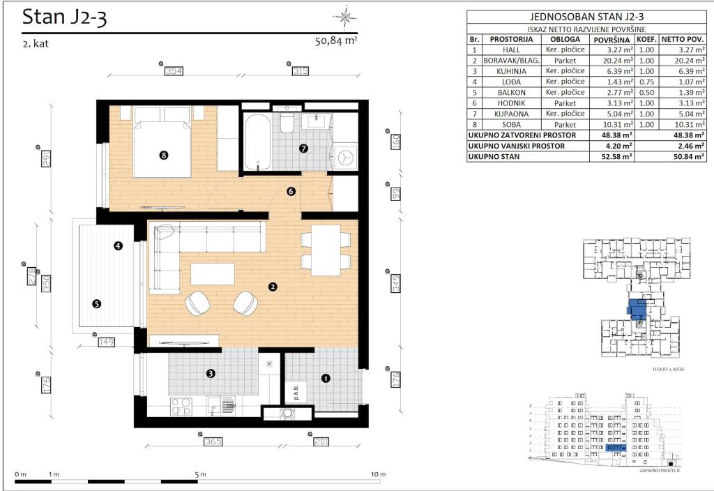 HERITAGE - Nova era stanovanja na TrešnjevciNa prestižnoj lokaciji Trešnjevke gradi se HERITAGE, jedinstvena stambena zgrada s 110 suvremenih stanova. Spoj tradicije i modernog dizajna donosi luksuz i udobnost prilagođenu svima.Planirano useljenje veljača 2027.Stan oznake J2-3 dvosoban stan na drugom katu južne orijentacije. Zatvorene površine 48,38 m2.Sastoji se od ulaznog hodnika, dnevnog boravka s kuhinjom i blagovaonicom te izlazom na balkon jedne spavaće sobe i kupaonice.