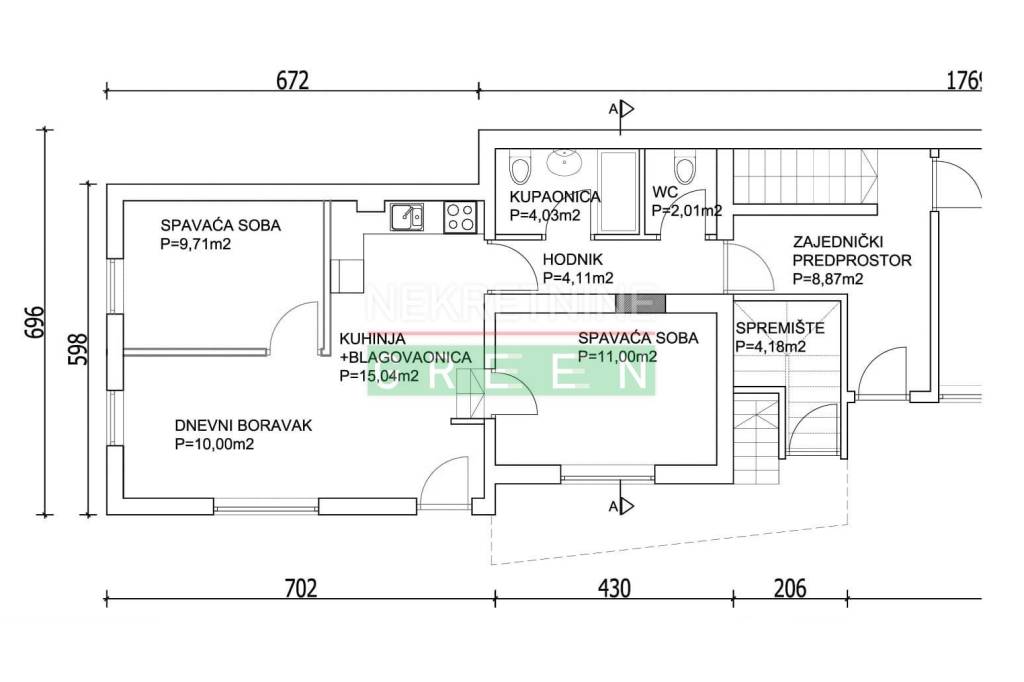 - dnevni boravak s kuhinjom i blagovaonicom, 2 sobe, kupaonica s wc-om, zasebni wc i hodnik.
