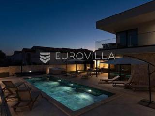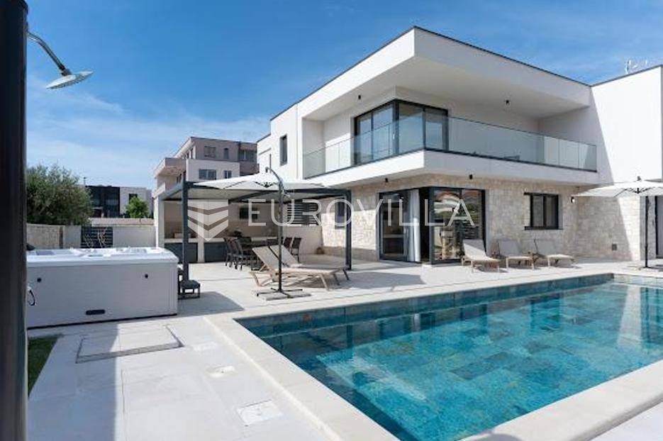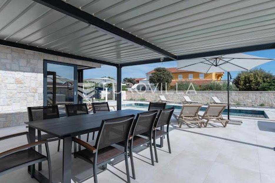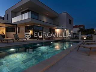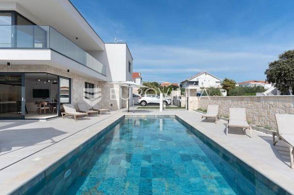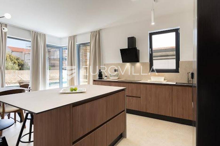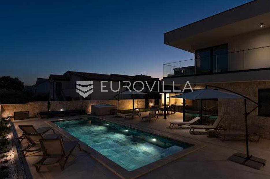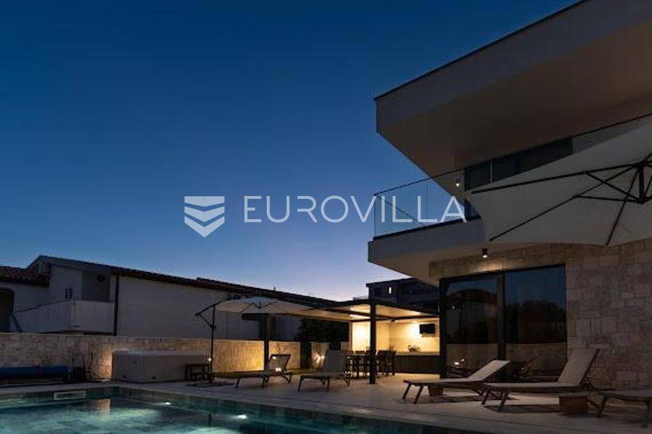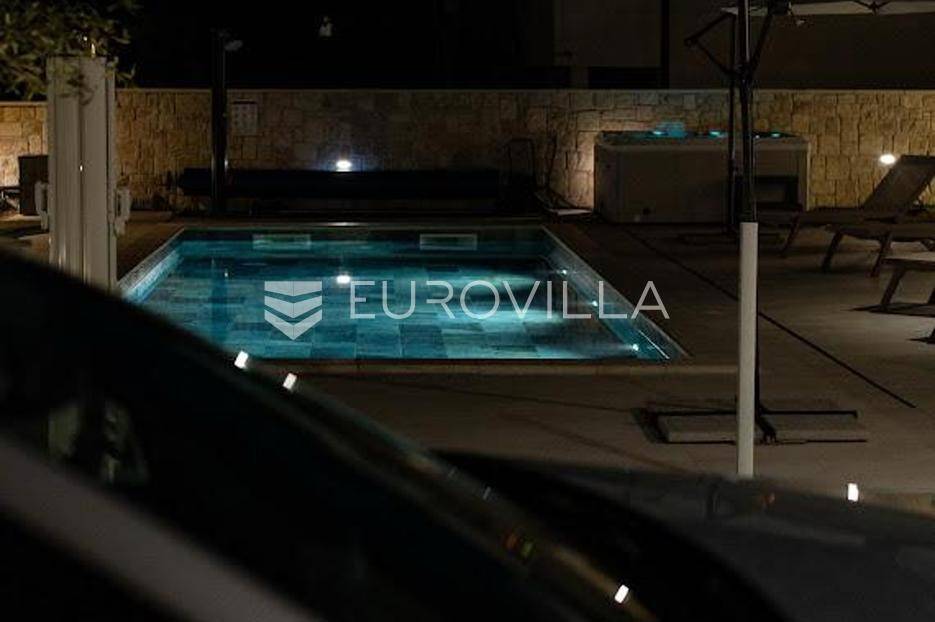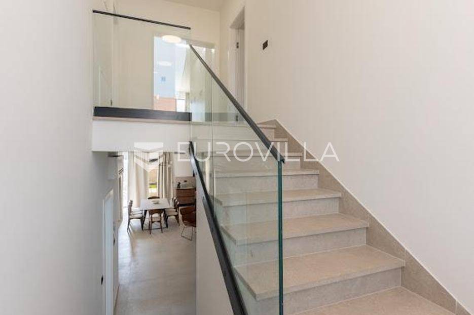 Pag Mandre, dvojna kuća s bazenom nalazi se na zemljištu površine 465 m2.Kuća se sastoji od prizemlja i kata, ukupne površine 220 m2.U prizemlju se nalazi kuhinja, blagovaonica i dnevni boravak otvorenog koncepta, spavaća soba s kupaonicom, gostinjski wc, vešeraj i spremište.Unutarnjim stepenicama dolazimo na kat gdje se nalazi ulazni prostor, tri spavaće sobe s kupaonicama te prostrana terasa.Nalazi se na 350 metara udaljenosti od mora i plaže.Oprema:AB konstrukcijaravni krov sa hidro i termoizolacijomtroslojna antracit stolarija sa brončanim efektomkomarnicivanjska ambijentalna rasvjetabio pergola na daljinsko upravljanjeDaikin dizalica toplinepostavljena priprema za solarne panelevideo nadzorsmart housesolarni tušU dvorištu se nalazi grijani bazen i jacuzzi koji su idealni za opuštanje i odmor u prekrasno uređenom okolišu.Osiguran je parking za dva automobila.Ova nekretnina izvrsna je kao kuća za odmor ili investicija za sve one koji se žele baviti turizmom.Više informacija na upit.
