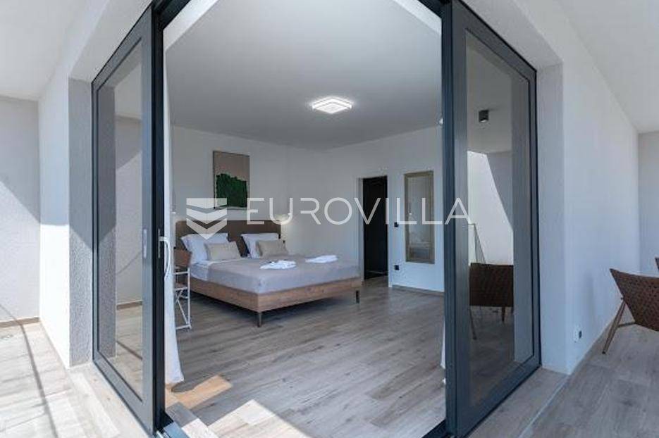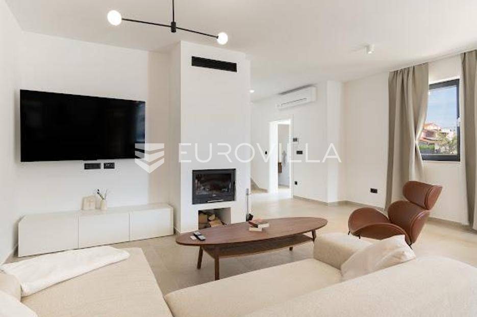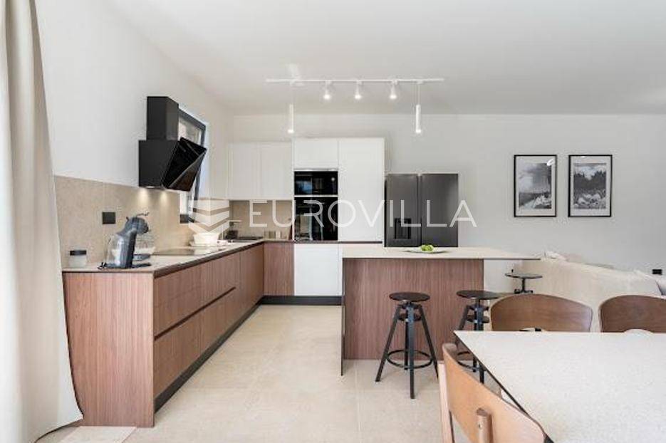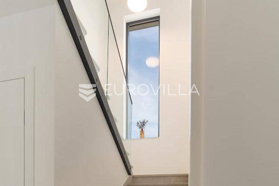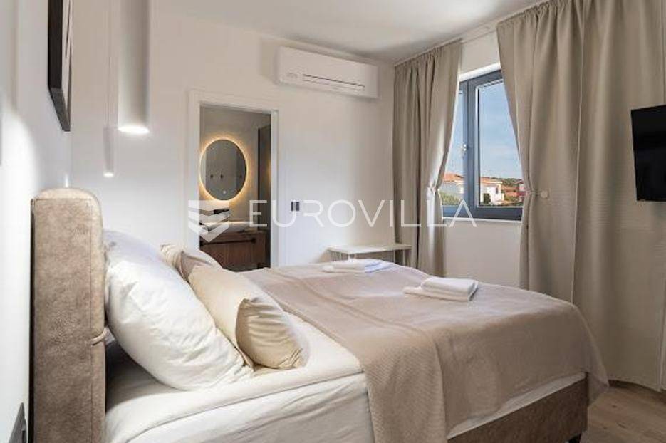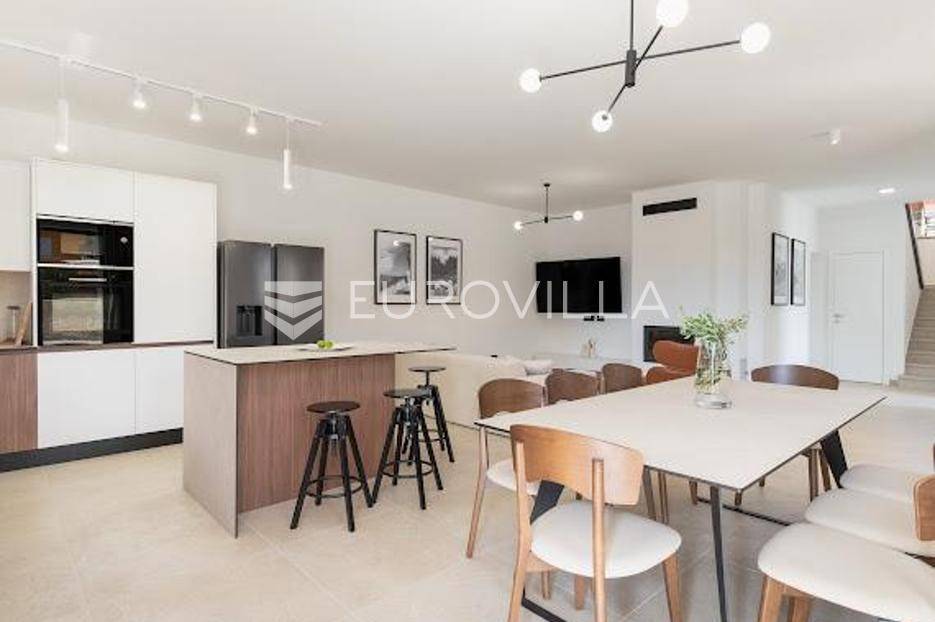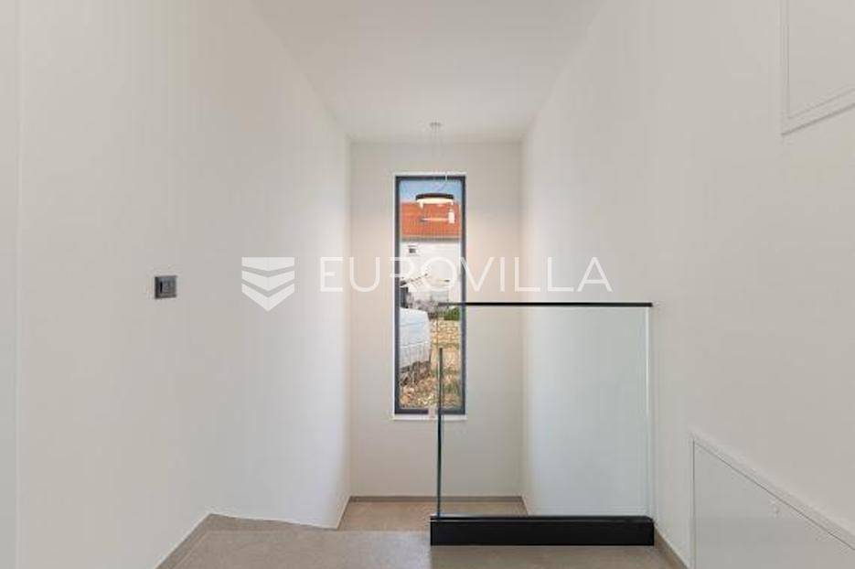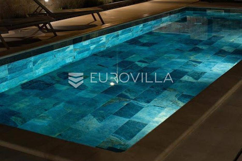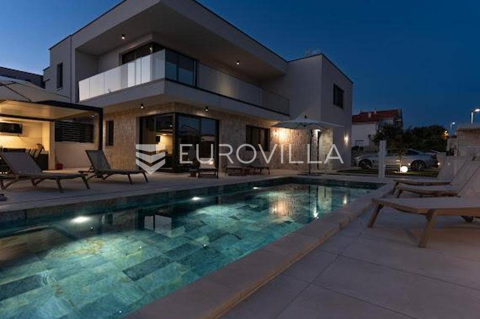 Pag Mandre, dvojna kuća s bazenom nalazi se na zemljištu površine 465 m2.Kuća se sastoji od prizemlja i kata, ukupne površine 220 m2.U prizemlju se nalazi kuhinja, blagovaonica i dnevni boravak otvorenog koncepta, spavaća soba s kupaonicom, gostinjski wc, vešeraj i spremište.Unutarnjim stepenicama dolazimo na kat gdje se nalazi ulazni prostor, tri spavaće sobe s kupaonicama te prostrana terasa.Nalazi se na 350 metara udaljenosti od mora i plaže.Oprema:AB konstrukcijaravni krov sa hidro i termoizolacijomtroslojna antracit stolarija sa brončanim efektomkomarnicivanjska ambijentalna rasvjetabio pergola na daljinsko upravljanjeDaikin dizalica toplinepostavljena priprema za solarne panelevideo nadzorsmart housesolarni tušU dvorištu se nalazi grijani bazen i jacuzzi koji su idealni za opuštanje i odmor u prekrasno uređenom okolišu.Osiguran je parking za dva automobila.Ova nekretnina izvrsna je kao kuća za odmor ili investicija za sve one koji se žele baviti turizmom.Više informacija na upit.