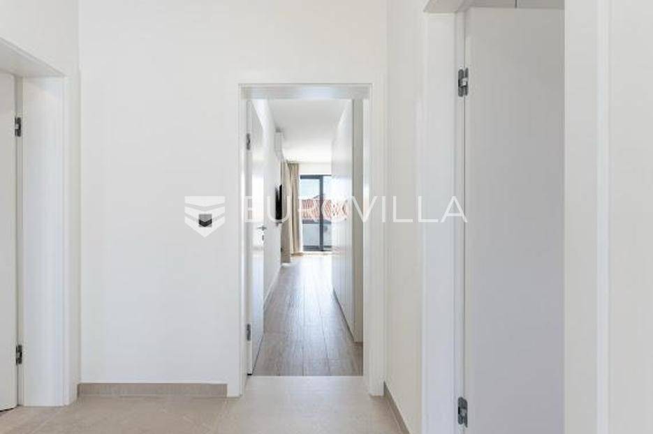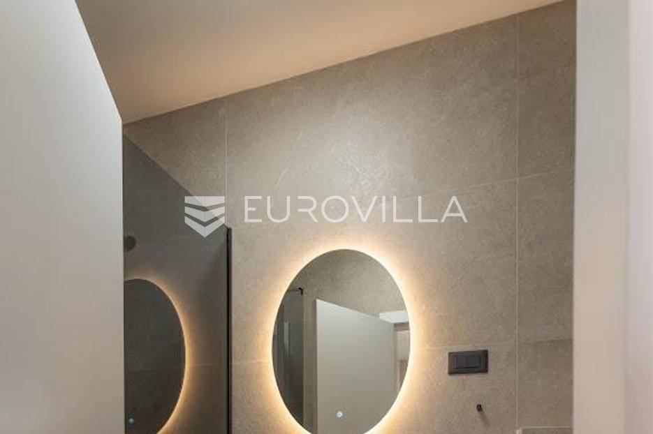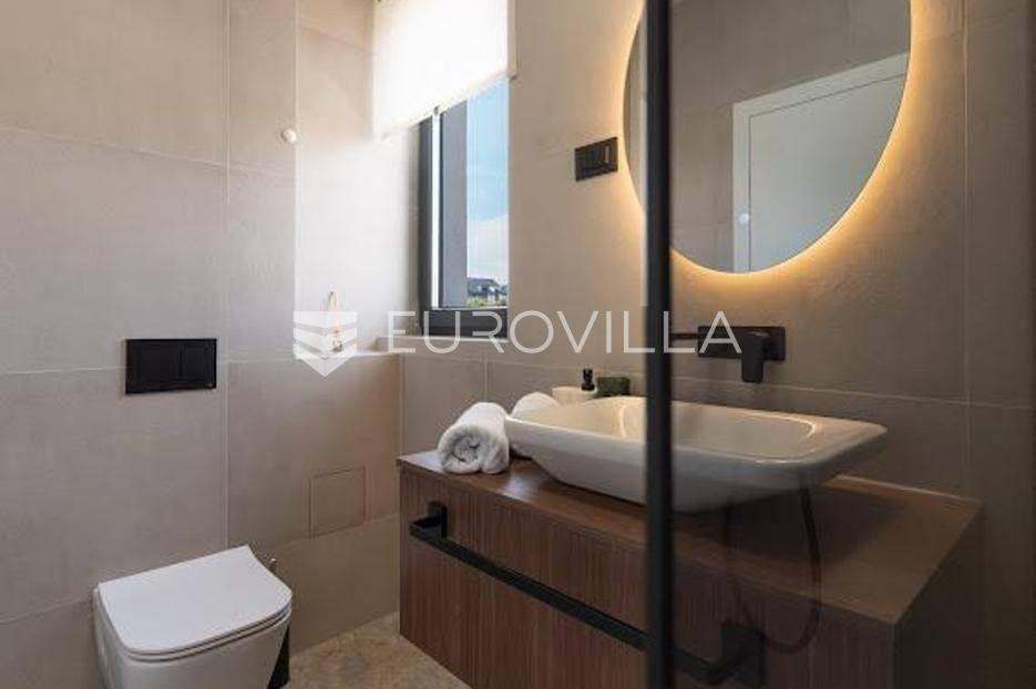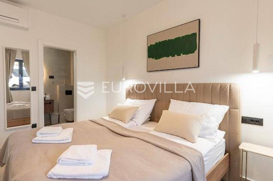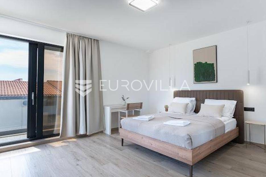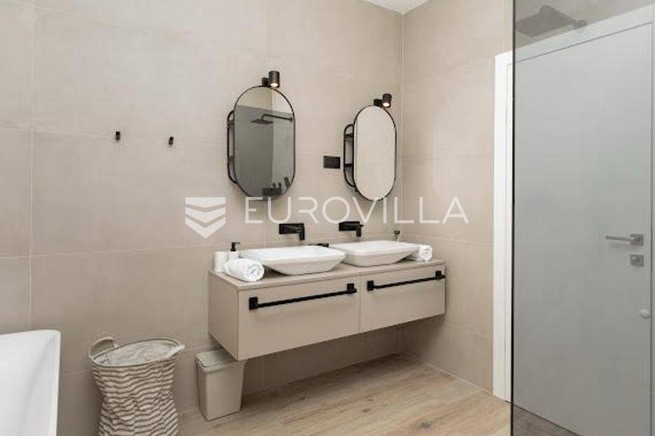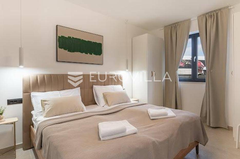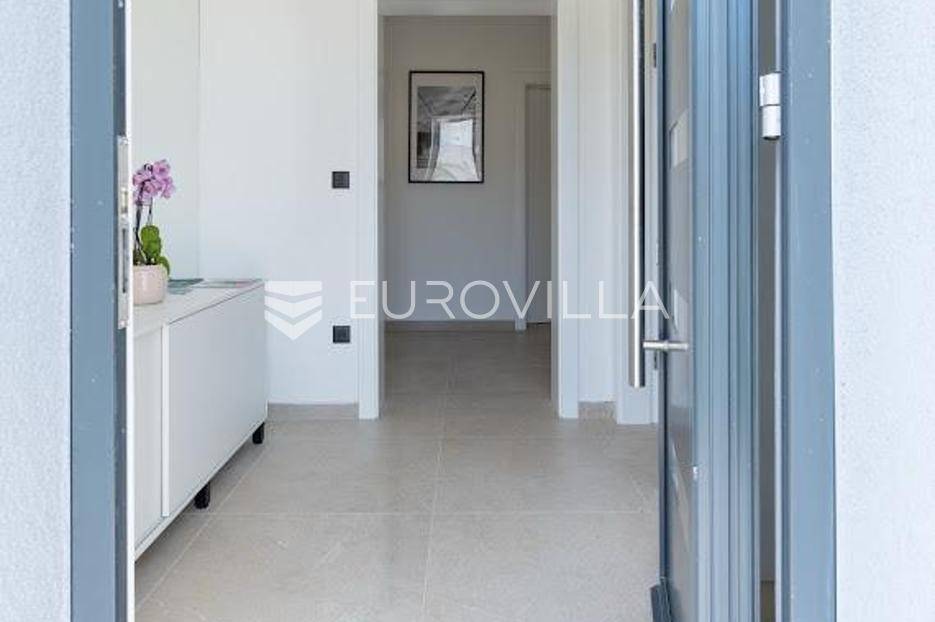 Pag Mandre, dvojna kuća s bazenom nalazi se na zemljištu površine 465 m2.Kuća se sastoji od prizemlja i kata, ukupne površine 220 m2.U prizemlju se nalazi kuhinja, blagovaonica i dnevni boravak otvorenog koncepta, spavaća soba s kupaonicom, gostinjski wc, vešeraj i spremište.Unutarnjim stepenicama dolazimo na kat gdje se nalazi ulazni prostor, tri spavaće sobe s kupaonicama te prostrana terasa.Nalazi se na 350 metara udaljenosti od mora i plaže.Oprema:AB konstrukcijaravni krov sa hidro i termoizolacijomtroslojna antracit stolarija sa brončanim efektomkomarnicivanjska ambijentalna rasvjetabio pergola na daljinsko upravljanjeDaikin dizalica toplinepostavljena priprema za solarne panelevideo nadzorsmart housesolarni tušU dvorištu se nalazi grijani bazen i jacuzzi koji su idealni za opuštanje i odmor u prekrasno uređenom okolišu.Osiguran je parking za dva automobila.Ova nekretnina izvrsna je kao kuća za odmor ili investicija za sve one koji se žele baviti turizmom.Više informacija na upit.