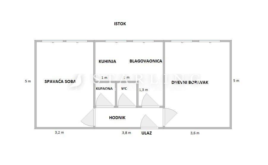 Stan se sastoji od dnevnog boravka, kuhinje s blagovaonicom, spavaće sobe, kupaonice, WC-a i hodnika.