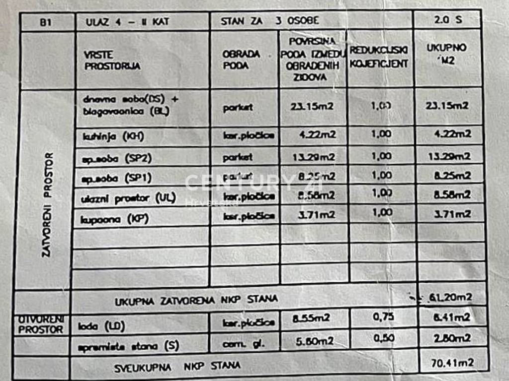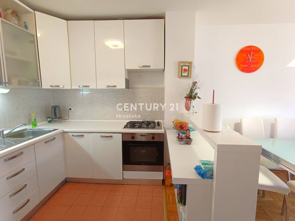 Raspored: ulaz i hodnik, velik otvoreni dnevni prostor (kuhinja + blagovaonica + dnevni boravak) s izlazom na lođu, dvije spavaće sobe te kupaonica s WC-om. Stanu pripada i spremište od 6 m2 u podrumu. Oko zgrade je besplatan parking.
