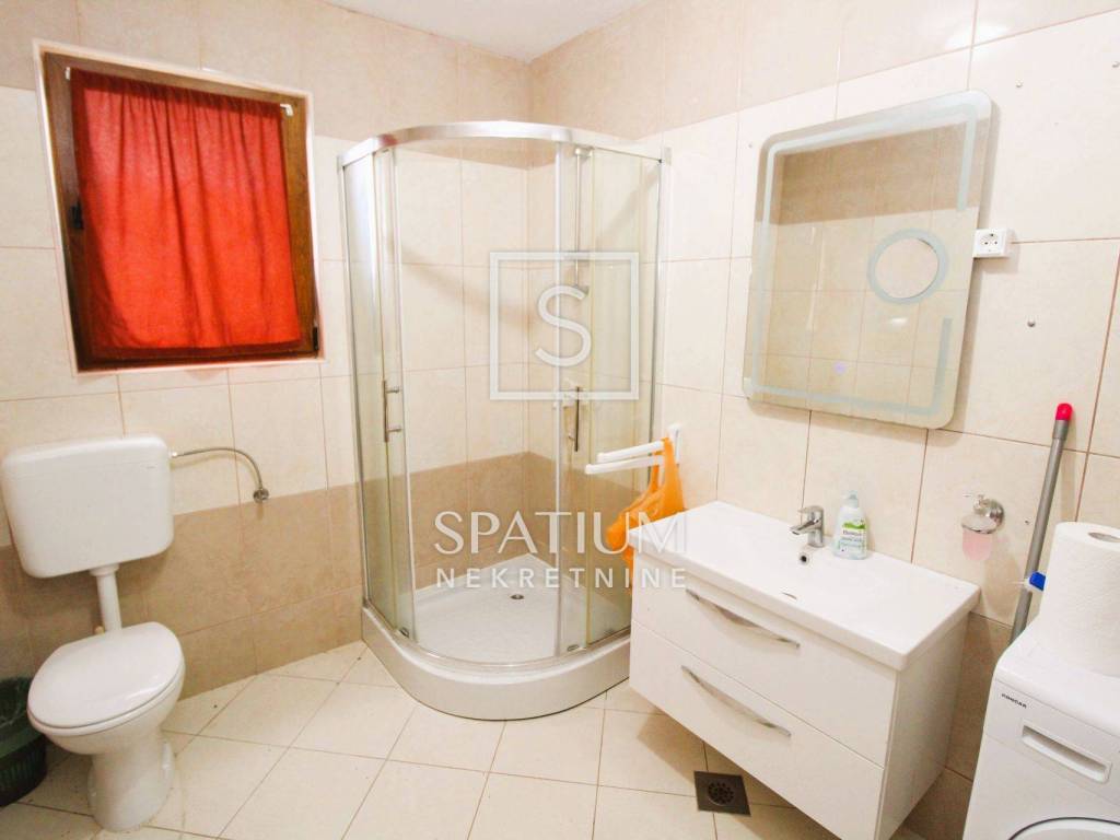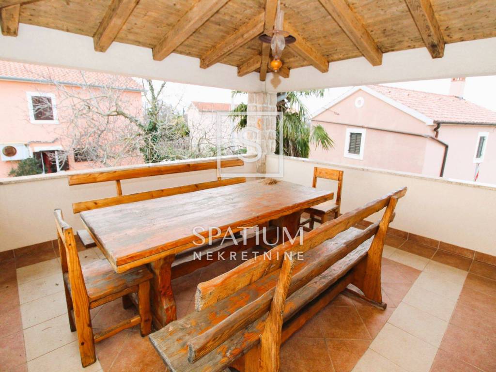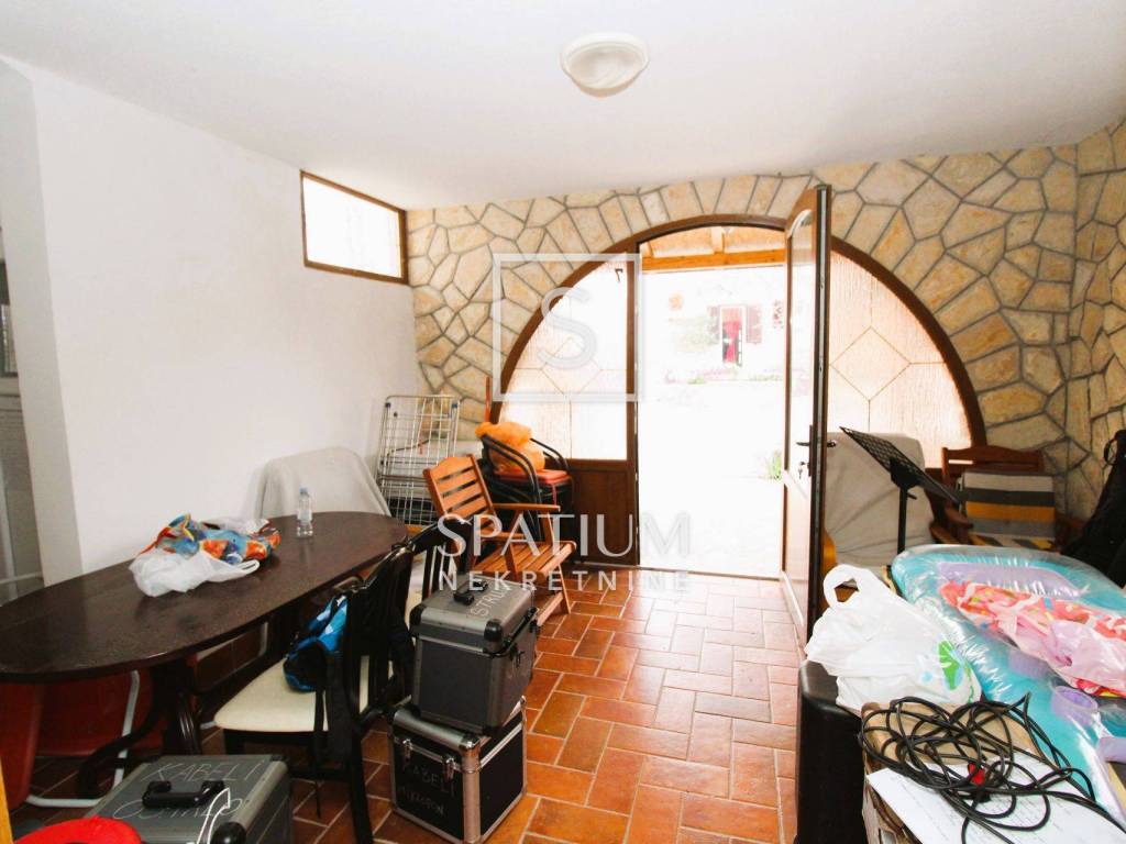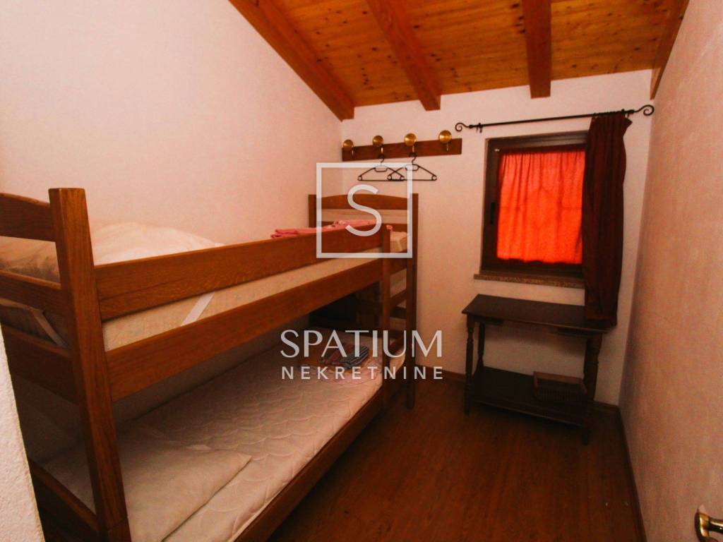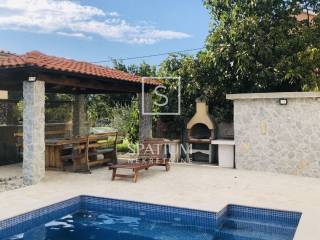GABONJIN, u ponudi imamo kamenu kuću s bazenom.  Sastoji se od prizemlja i kata na kojima su dvosobni stanovi s dnevnim boravkom po 75 kvadrata svaki, ulazi su odvojeni vanjskim popločanim stepenicama. Na velikoj okućnici od više od 800 kvadrata nalaze se bazen, roštilj i natkriveni drveni stol.