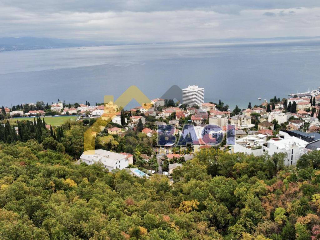Na mirnoj lokaciji sa panoramskim pogledom na more prodajemo ovo prekrasno građevinsko zemljište koje je udaljeno svega 700 metara od centra Opatije što ga čini jako atraktivnim.