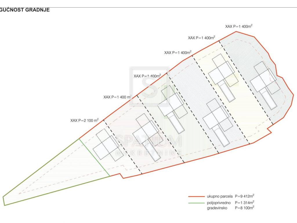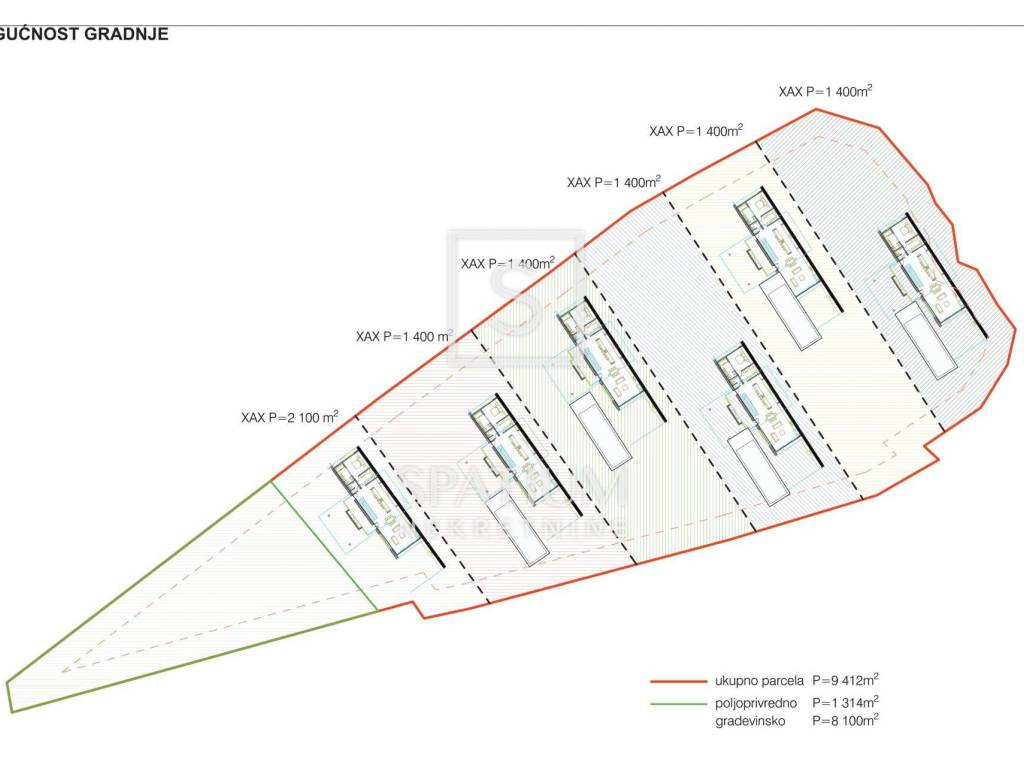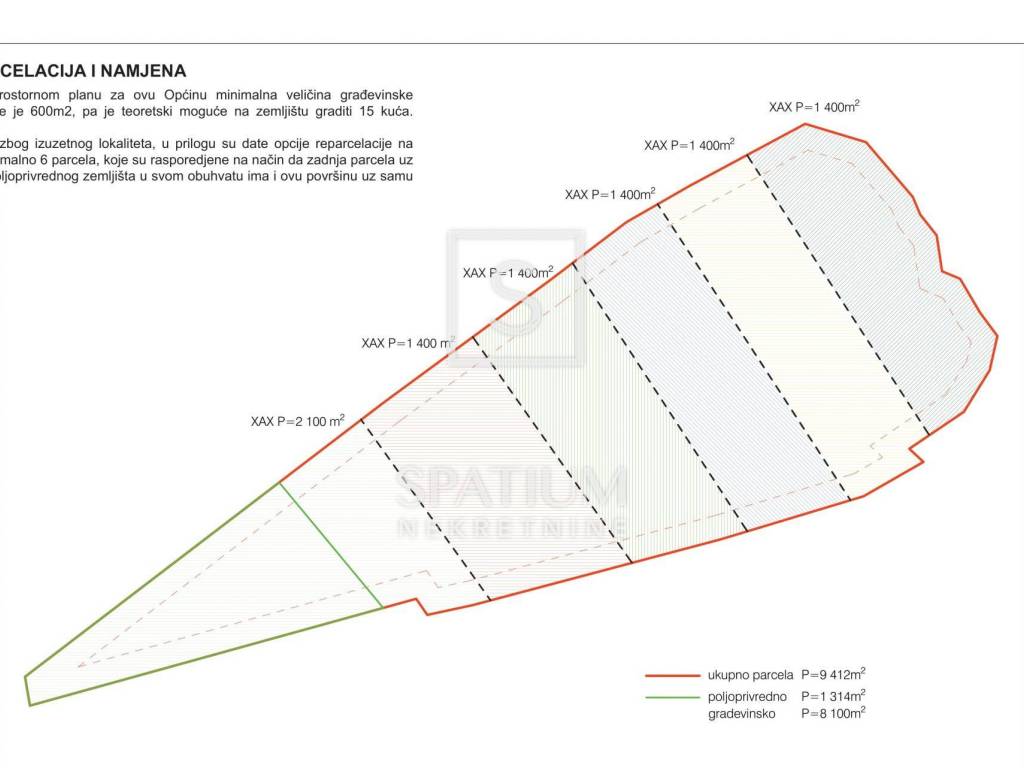 Prema Prostornom planu minimalna građevinska čestica iznosi 600 m², što omogućava parcelaciju za maksimalno 15 kuća. Međutim, zbog izuzetne lokacije, izrađene su varijante parcelacije na 6 prostranih parcela, uz mogućnost prilagodbe prema potrebama investitora.