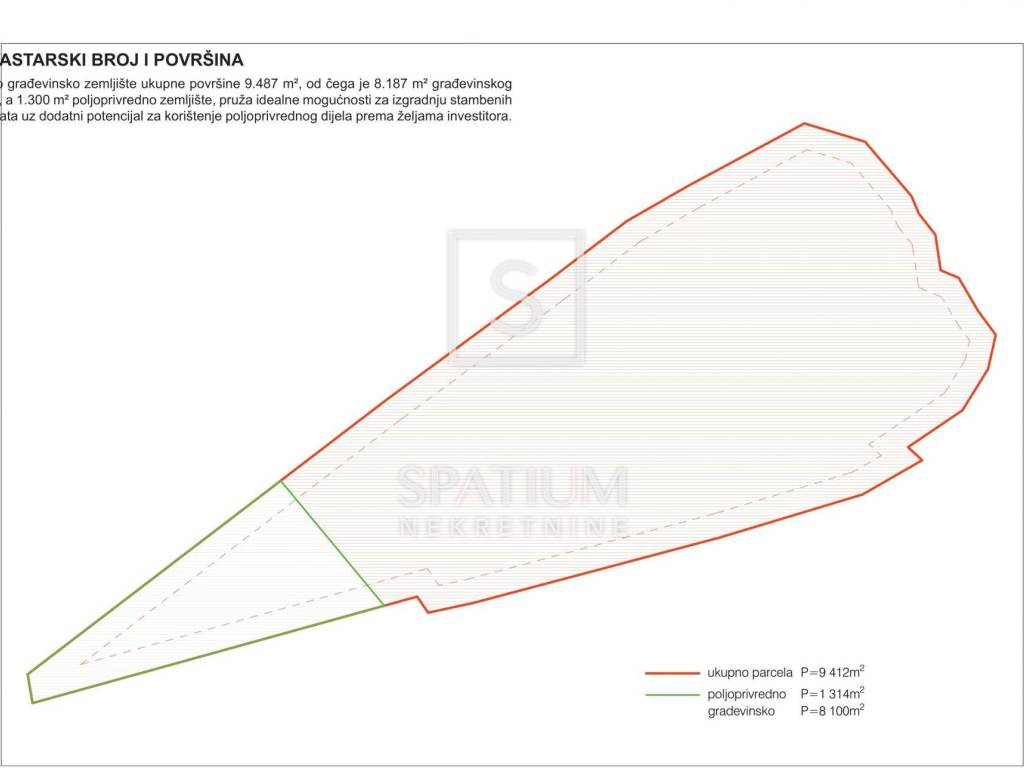 KANFANAR, u ponudu smo dobili prostrano građevinsko zemljište ukupne površine 9.487 m², od čega je 8.187 m² građevinsko, a 1.300 m² poljoprivredno zemljište.