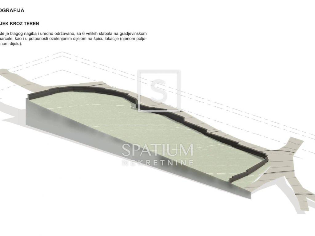 Parcela ima blagi nagib, uredno je održavana te ima šest velikih stabala na građevinskom dijelu, dok je poljoprivredni dio u potpunosti ozelenjen. Zemljište je u potpunosti ograđeno kvalitetnim suhozidom visine 1,6 m, dužine 460 m, s ukrasnim elementima i integriranom rasvjetom u nišama. Pristup je omogućen kroz dva ulaza, smještena na južnoj i istočnoj strani parcele.