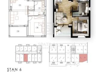 Sastoji se od ulaznog prostora, dvije spavaće sobe, kupaone te dnevnog boravka s kuhinjom i blagovaonom iz kojih se izlazi na lođu. Pripadaju mu dva parkirna mjesta u garaži te ostava površine 12,00 m2.