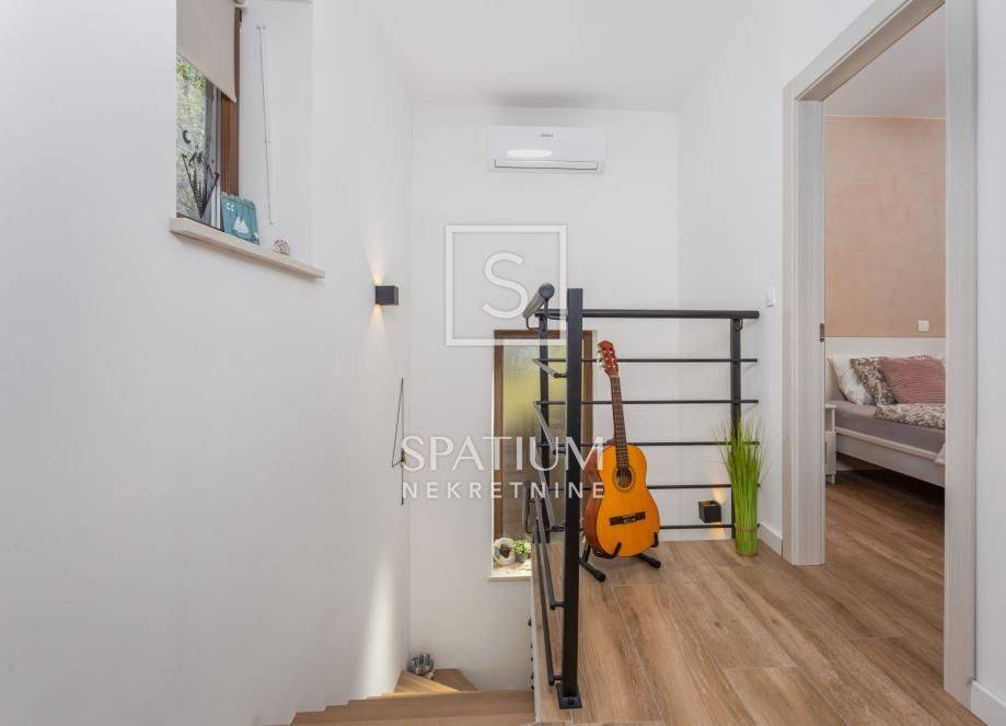 VEPRINAC, u ponudu smo dobili dvojnu kuću s okućnicom. Smještena na mirnoj lokaciji, sastoji se od suterena, gdje se nalazi garaža s nenatkrivenom terasom te prizemlja i kata koji čine dvoetažni stan. Prizemlje se sastoji od ulaznog hodnika, kuhinje, dnevnog boravka s blagovaonicom, ostave i terase. Unutarnje stepenište vodi na kat gdje se nalaze dvije spavaće sobe, jedna s izlazom na terasu te kupaonica. Ukupna stambena površina iznosi 178.10 m2. Na okućnici od 82,80 m2 nalaze se roštilj i hidro - masažna kada te bazen na korištenje koji se dijeli s drugom polovicom dvojnog objekta. Također, na okućnici ima dovoljno mjesta za parkiranje nekoliko vozila. Postavljeno je električno podno grijanje, kamin te jedinice klima uređaja za grijanje i hlađenje prostora. Prodaje se kompletno namješteno. Pogodno za investiciju u svrhu najma ili za život.
