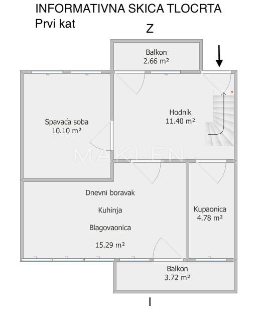 Prvi kat (NKP = 48 m2) se sastoji od dnevnog boravka s kuhinjom i blagovaonicom, spavaće sobe, kupaonice, hodnika te dva balkona.