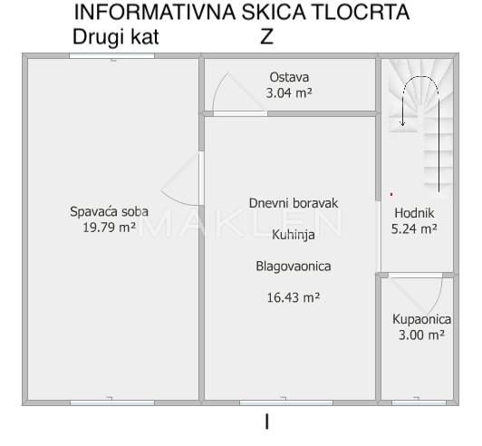 Drugi kat (NKP = 48 m2) se sastoji od dnevnog boravka s kuhinjom i blagovaonicom, spavaće sobe, kupaonice, ostave te hodnika.