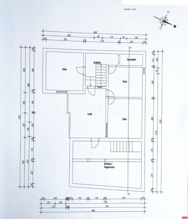 - PRVI KAT: open space dnevni boravak s kuhinjom i blagovaonom, tri sobe, spremište te loggie.