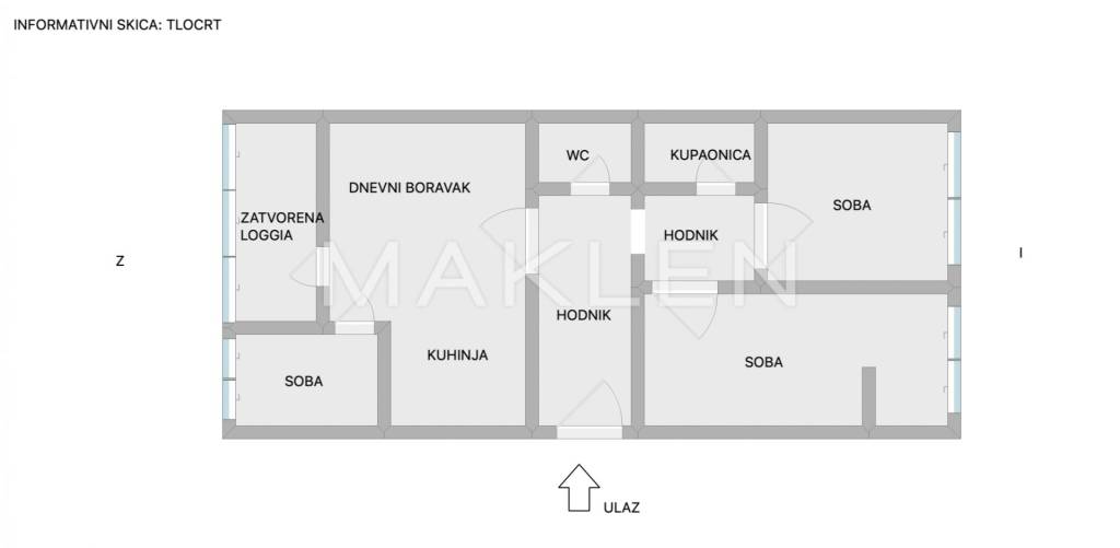 Stan se sastoji od dnevnog boravka, kuhinje s blagovaonom, tri sobe, kupaonice, WC-a, hodnika te zatvorene loggie.