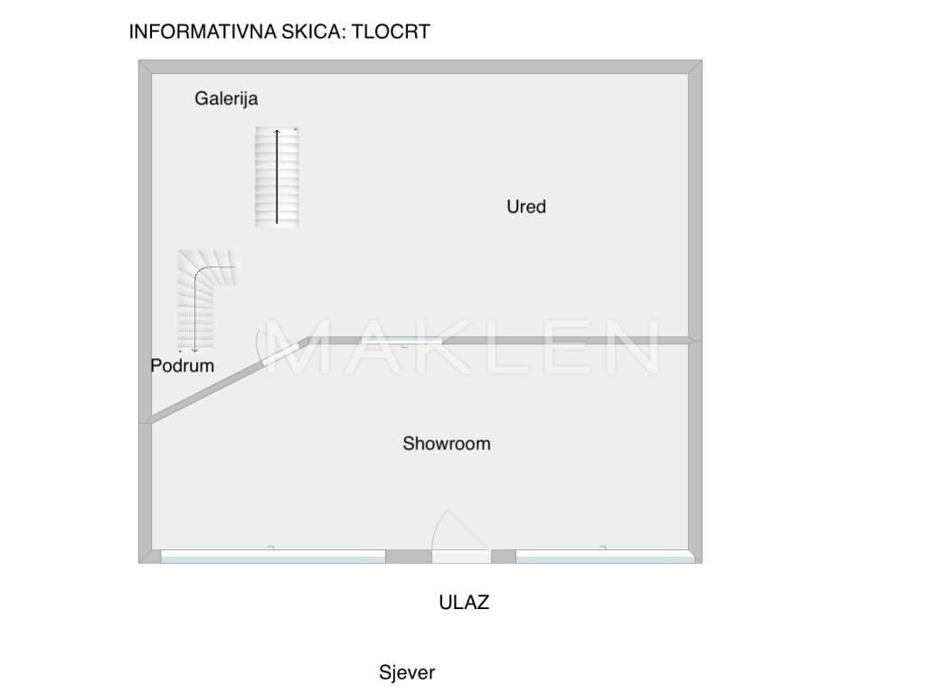Prizemlje 44 m2 je podijeljeno na dvije prostorije (ured i showroom) koje se vrlo lako mogu vratiti u istu, te male galerije.