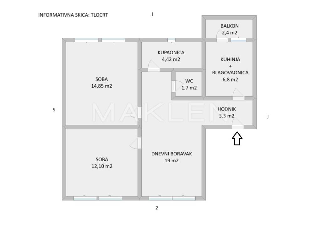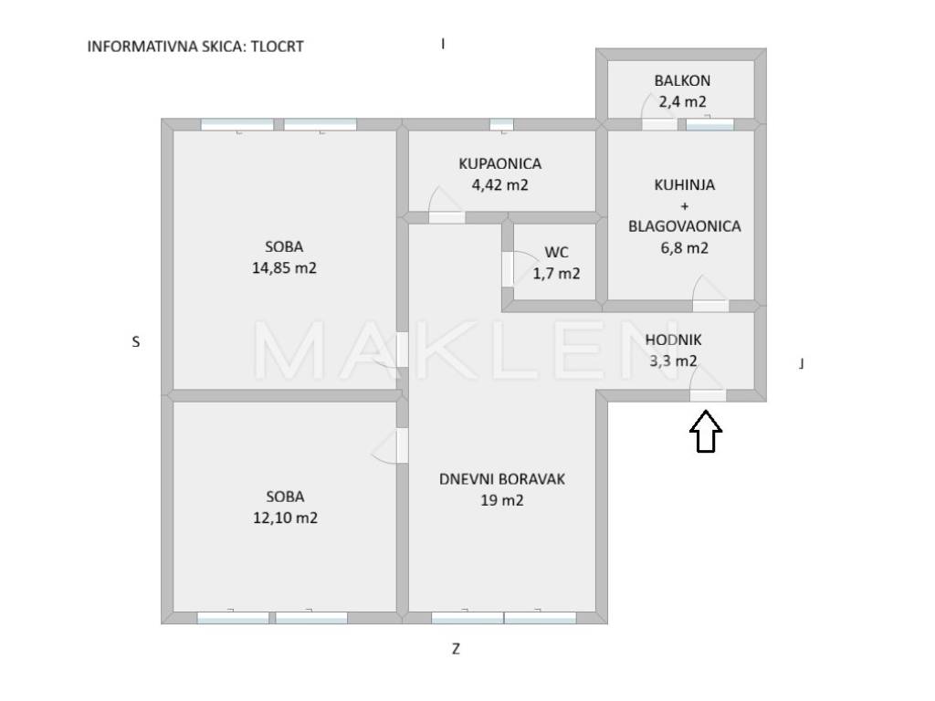 Stan se sastoji od dnevnog boravka, kuhinje s blagovaonicom, dvije spavaće sobe, kupaonice, zasebnog WC-a, hodnika te balkona.