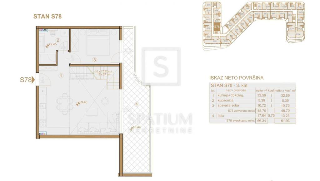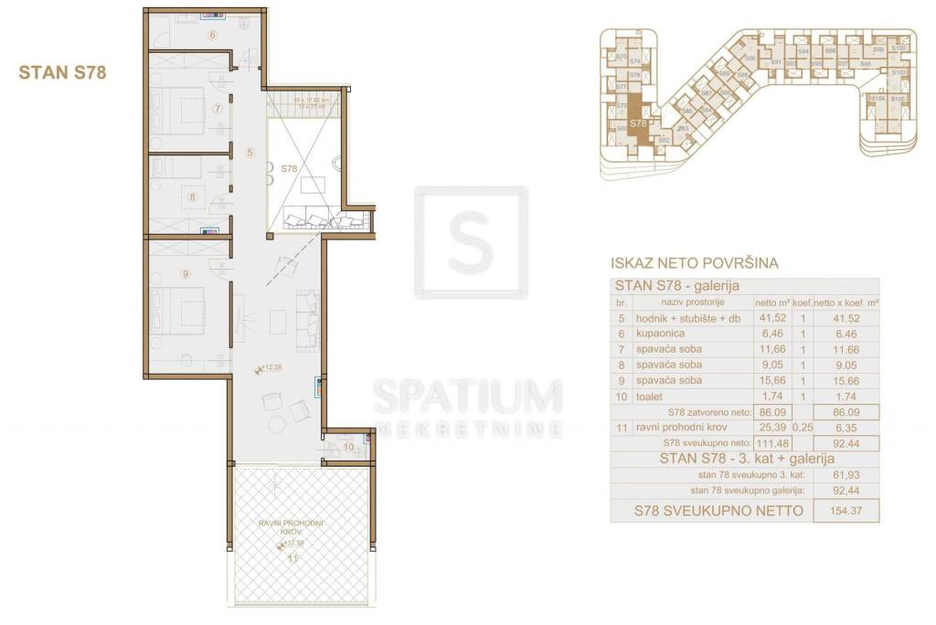 Stan S78 smješten je na trećem katu i prostire se na dvije etaže s ukupnom površinom od 154,37 m². Riječ je o prostranom dvoetažnom stanu s galerijom, koji nudi panoramski pogled na more i grad Poreč.