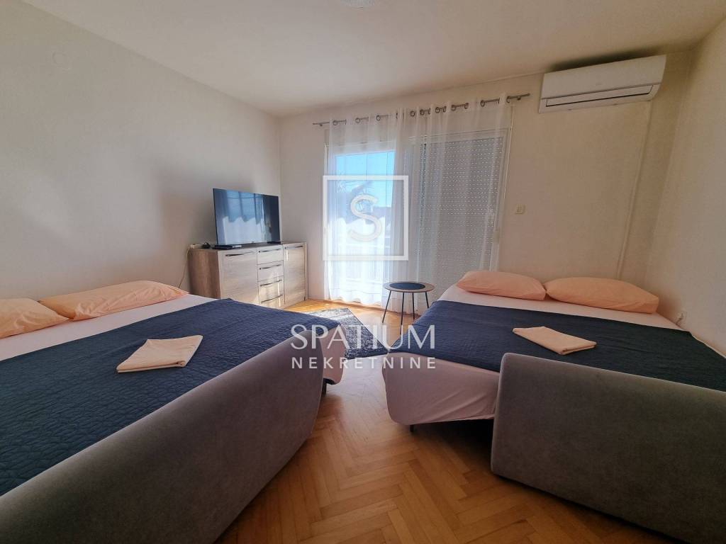 Ukupna površina stana iznosi 89 m2, a sastoji se od ulaznog hodnika, tri spavaće sobe, kuhinje s blagovaonicom, dnevnog boravka i dva balkona s prekrasnim pogledom na more. Opremljen je klima uređajima te peći na kruta goriva. Stanu pripada veliko dvorište sa spremištem i garaža koja je trenutno preuređena u dopunski prostor te tavanski prostor s mogućnošću nadogradnje visokog potkrovlja. Lokacija izvrsna, od centra i od plaže je udaljen svega 300 metara.
