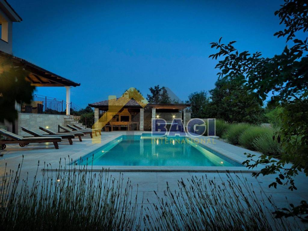 Ova predivna villa sa bazenom smjestila se u malom selu Štokovci. S obzirom da se radi o Istarskom selu sama villa je građena u Istarskom duhu. Kada dolazimo do same vile prvo šta se može primjetiti je kvalitetno zidani suhozid visine 1,5 metra, suhozid daje pravi Istarski ugođaj ovoj villi. na ulazu se nalaze 3 natkrivena parkirna mjesta te sa lijeve strane možemo primjetiti red maslina i travnjak.