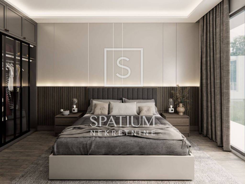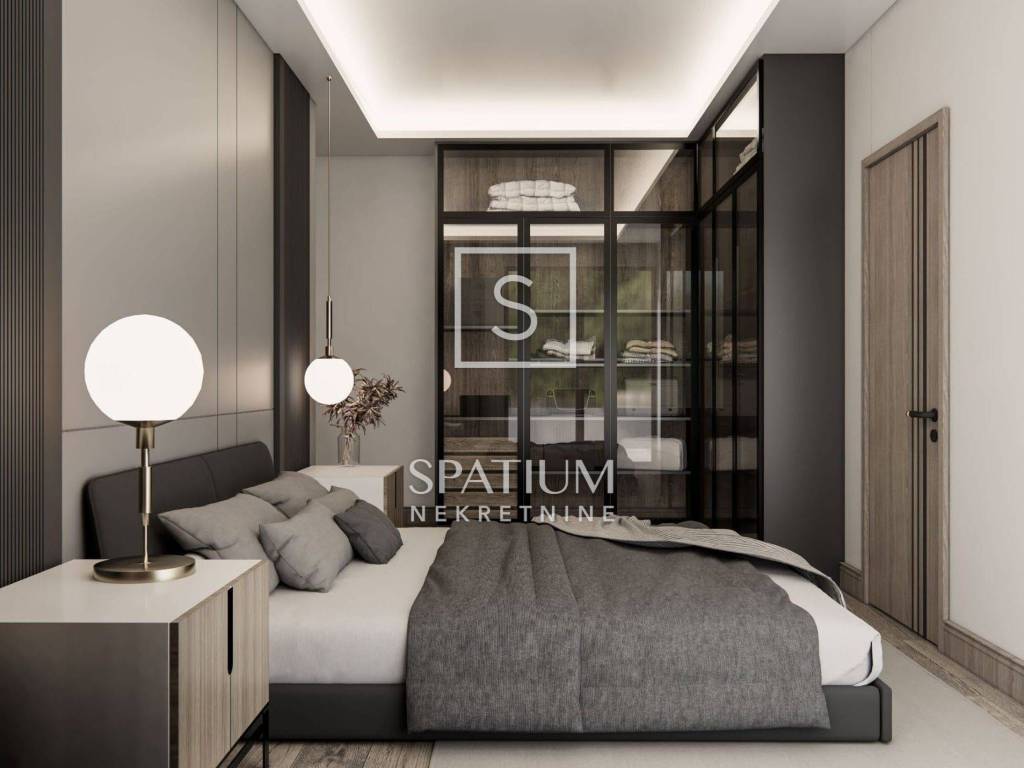 Ovaj penthouse smješten je na drugom katu moderne stambene zgrade s ukupno pet stanova, a njegova ukupna površina iznosi 161 m². Sastoji se od hodnika, gostinjskog toaleta, spremišta, kuhinje povezane s blagovaonicom i prostranim dnevnim boravkom koji vodi na veliku nenatkrivenu terasu. Stan ima tri spavaće sobe, svaka s vlastitom kupaonicom (en suite). Dvije spavaće sobe dijele lođu površine 5 m², dok glavna spavaća soba raspolaže vlastitom nenatkrivenom terasom. Iz penthousea se pruža očaravajući panoramski pogled na more, što ga čini idealnim domom za one koji traže luksuz, udobnost i prestižnu lokaciju.