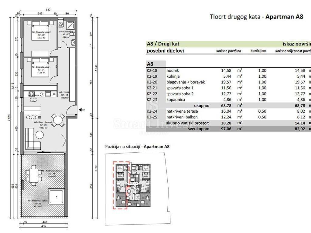 OPATIJA, Ekskluzivan stan 2S+DB s terasom, pogledom na cijeli Kvarner i garažnim parkirnom mjestom, u luksuznoj novogradnji s garažom i liftom. APARTMAN A8 se nalazi na 2. katu, sveukupna površina stana i pripadaka iznosi 99.33 m2. Sastoji se od hodnika, dnevnog boravka s kuhinjom i blagovaonicom, dvije spavaće sobe, kupaonice, natkrivene terase i natkrivenog balkona (ukupne netto površine 82.92 m2), s pripadkom spremišta površine 4.16 m2 i garažnog parkirnog mjesta površine 12.25 m2, što sve čini sveukupnu površinu stana i pripadaka od 99.33 m2. Mogućnost kupnje još jednog parkirnog mjesta u garaži po cijeni od 25.000 Eur + PDV. EKSKLUZIVNO SAMO KOD NAS U PONUDI!!! Navedena cijena se odnosi na kompletno završen stan po principu ključ u ruke, bez namještaja. U cijenu je uključen PDV 25%, kupac je oslobođen plaćanja poreza na promet nekretnina. U slučaju kupnje na firmu registriranu u Hrvatskoj moguć je povrat kompletnog PDV-a nakon kupoprodaje. Za više informacija i razgled nazovite +385/99/320-0008 ID KOD AGENCIJE: 12432 Marin Baričević Agent s licencom Mob: +385(0)99/320-0009 E-mail: marin@smart-invest.hr www.smart-invest.hr Agencija Opatija Ovlašteni posrednik Mob: +385/99/320-0008 E-mail: office@smart-invest.hr www.smart-invest.hr