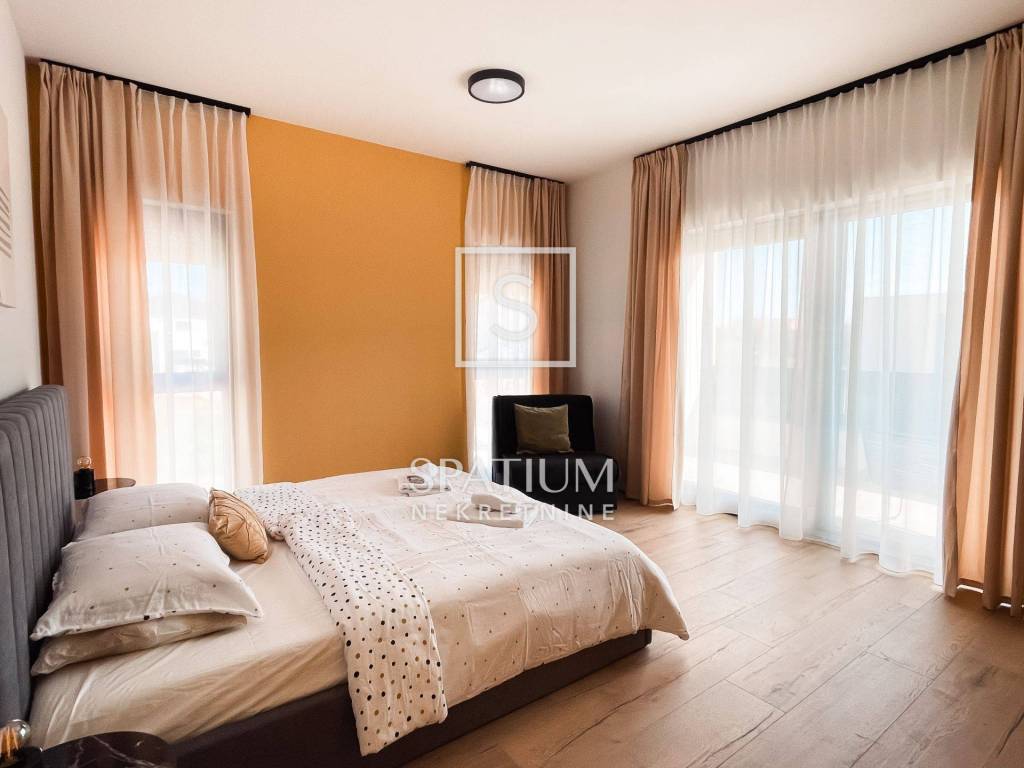 MEDULIN, u ponudu smo dobili luksuznu novogradnju smještenu na mirnoj lokaciji, udaljenu samo 200 metara zračne udaljenosti od mora i 250 metara od centra naselja. Kuća ima ukupnu površinu od 198,53 m², uz okućnicu od 170 m² i parcelu površine 419 m². Izgrađena je 2024. godine, te posjeduje uporabnu dozvolu i energetski certifikat.