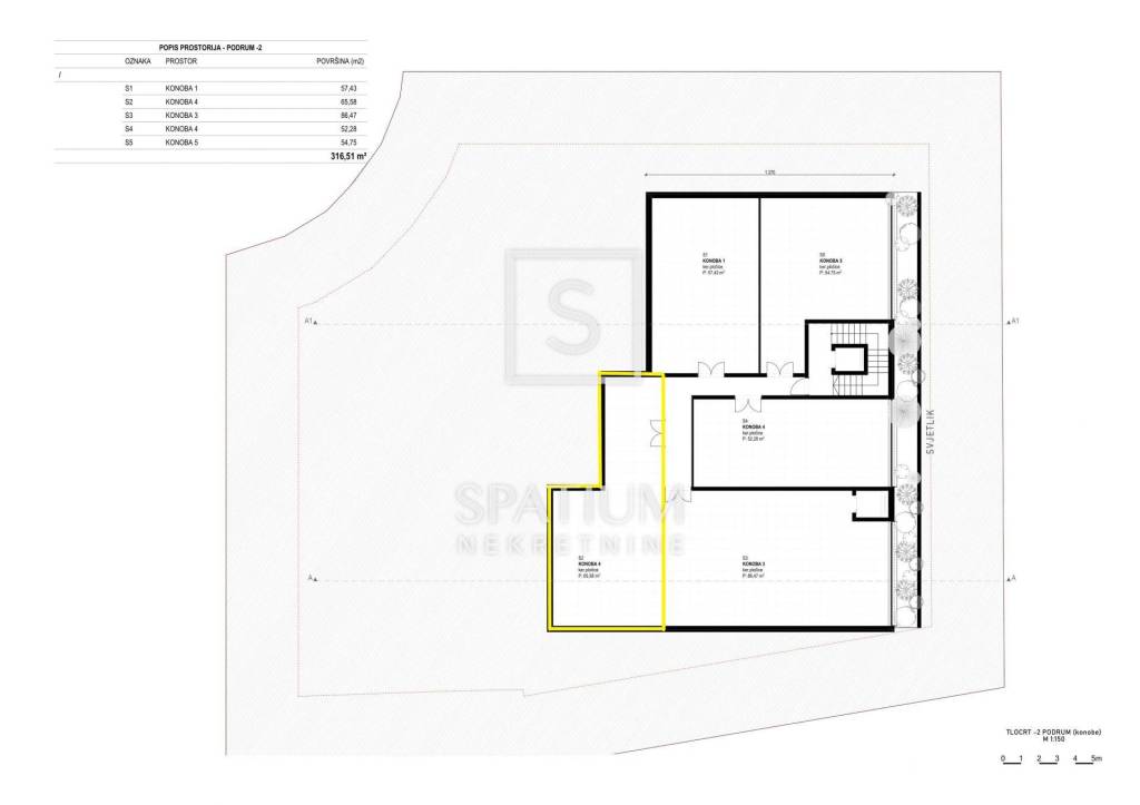 Stanu pripada konoba površine 66 m² smještena na etaži -2, dok su na etaži -1 osigurana tri garažna parkirna mjesta po stanu.