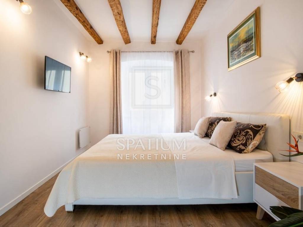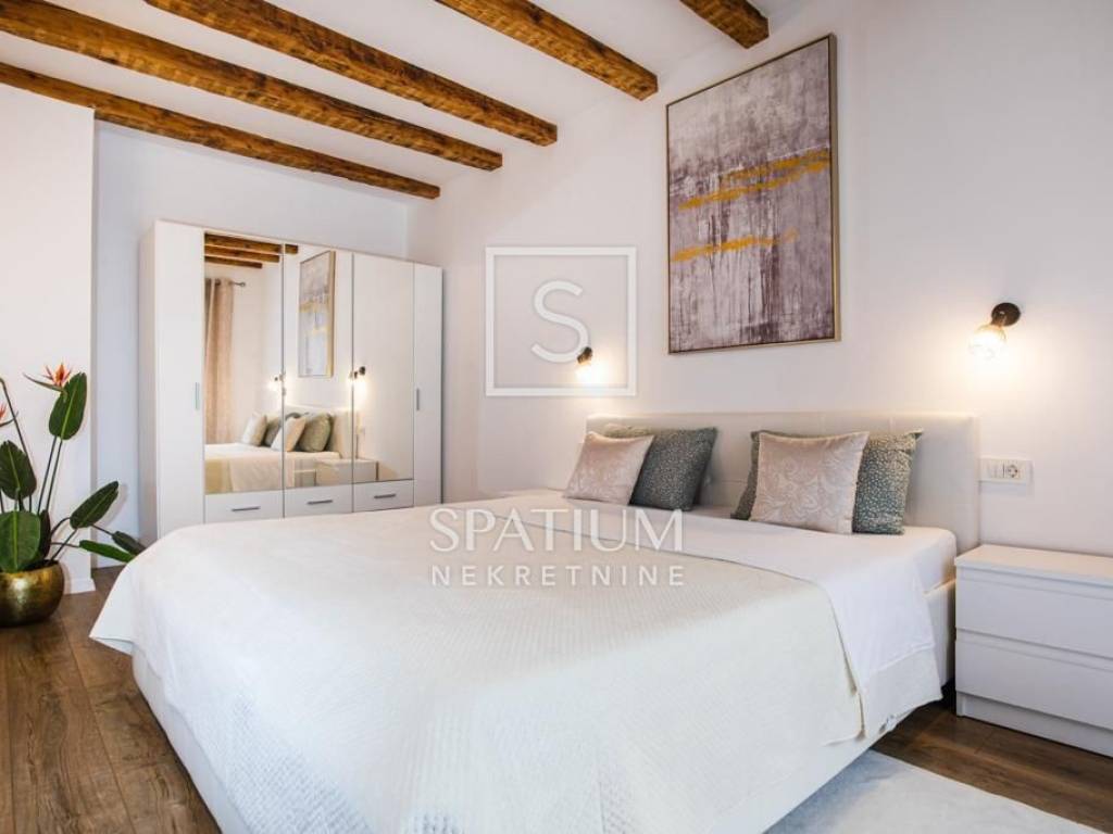 Stan je namješten i opremljen modernim interijerom, a glavna spavaća soba ima walk-in ormar za potpunu komociju. Unutarnjim uređenjem dominiraju opuštajuća zelena i bijela boja te drvo koje daje izniman ugođaj topline.