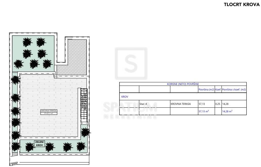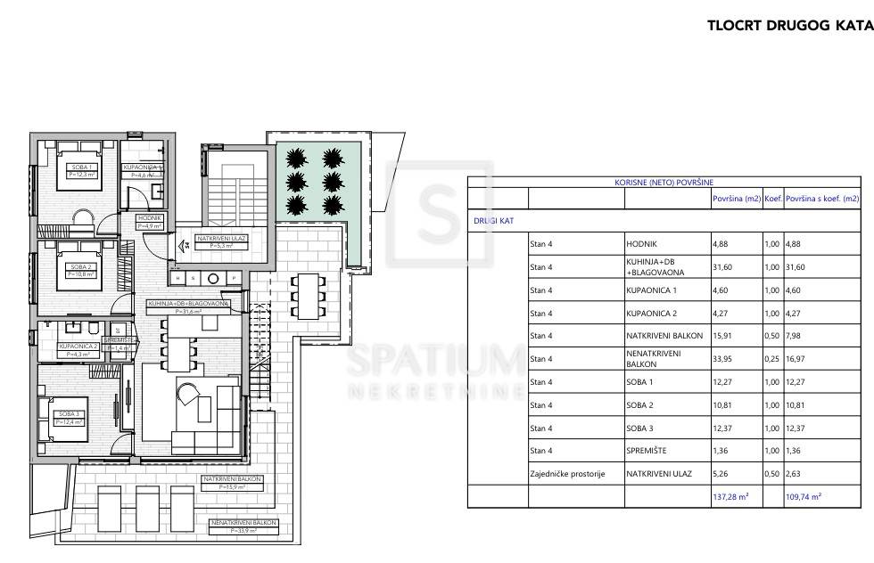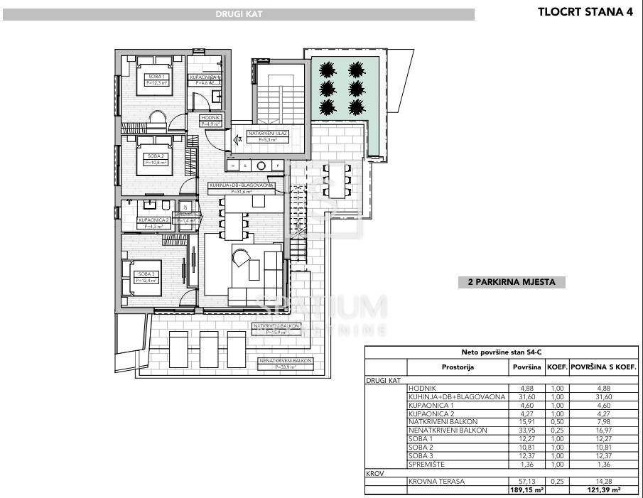 NJIVICE, OTOK KRK, u ponudi je trosoban stan s krovnom terasom u manjoj novogradnji. Površina je 123,60 m2 i to raspoređena na sljedeći način: kuhinja s blagovaonom i dnevnim boravkom 32,53 m2, tri spavaće sobe 12,57, 10,80 i 12,84 m2, dvije kupaonice 5,07 i 4,27 m2, ostava 1,36 m2, hodnik 4,90 m2 te natkriveni balkon površine 49,96 m2 s kojeg stepenice vode na krovnu terasu površine 57,13 m2 s koje se pruža lijep pogled na more. Stanu pripadaju dva parkirna mjesta u garaži i spremište.