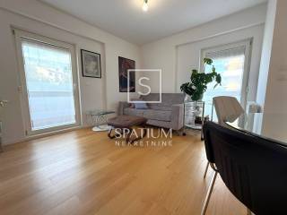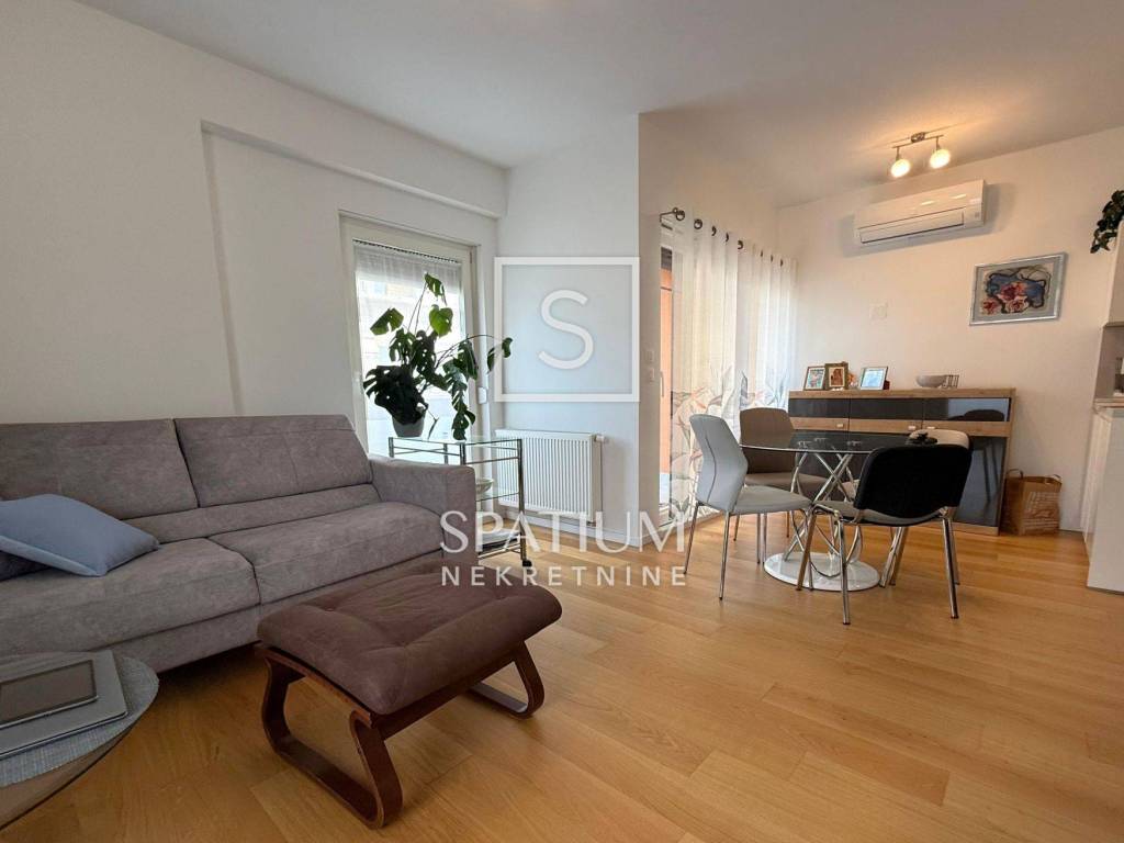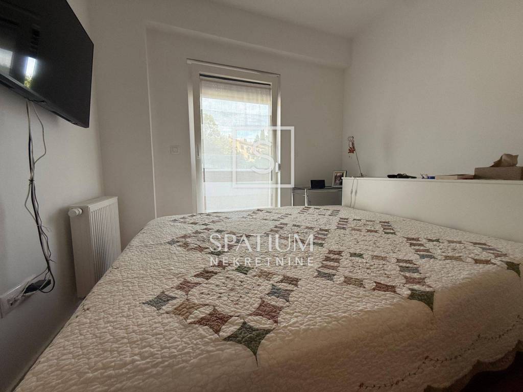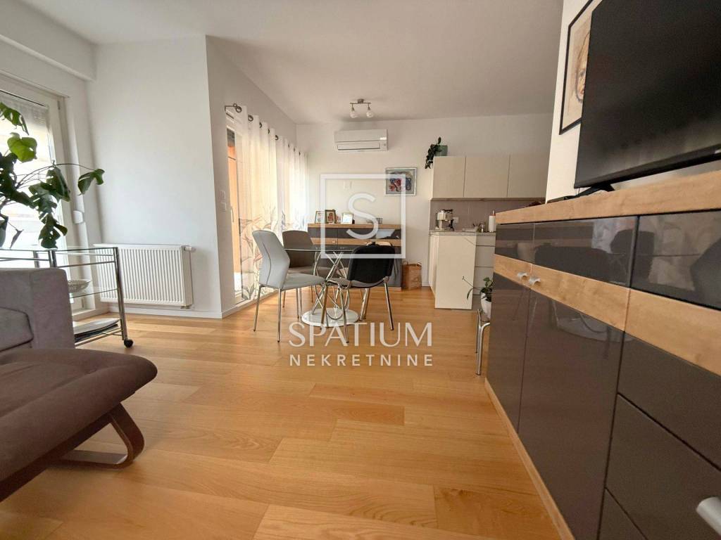 KANTRIDA, EKSKLUZIVNO U NAŠOJ PONUDI dvosoban je stan u novogradnji na odličnoj lokaciji. Sveukupna je površina 77,31 m2 a stan se sastoji od ulaznog hodnika, toaleta, kupaone, ostave, dvije spavaće sobe te prostranog dnevnog boravka s kuhinjom i blagovaonom. Iz dnevnog se dijela izlazi na lođu i terasu. Stanu pripada jedno garažno parkirno mjesto površine 12,82 m2 i ostava od 1,63 m2. Centralno je, plinsko, etažno grijanje te klima uređaj a stan se prodaje djelomično namješten.