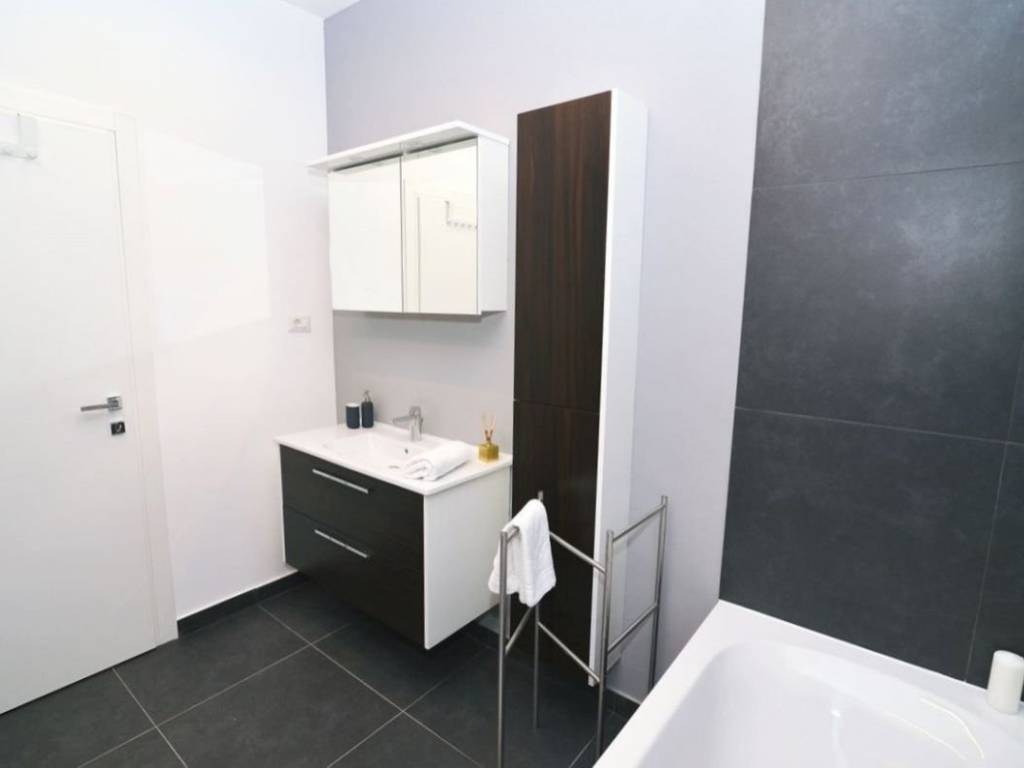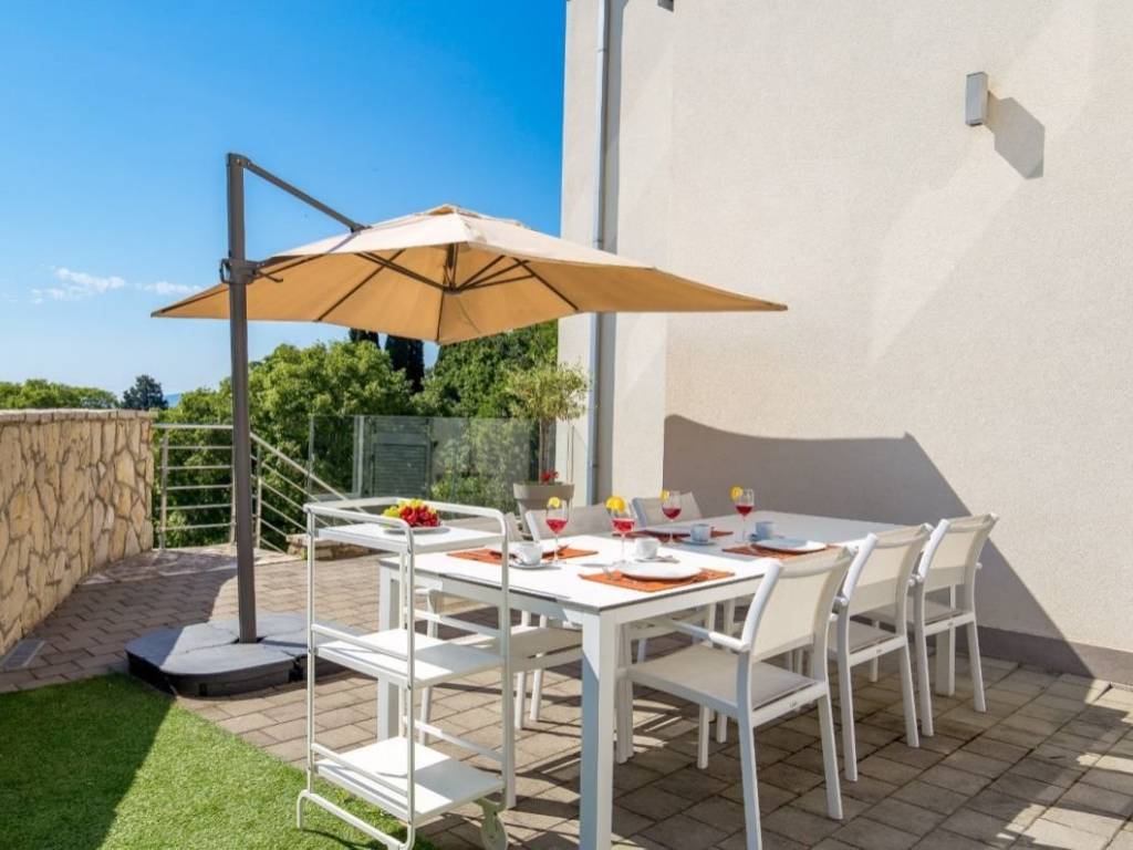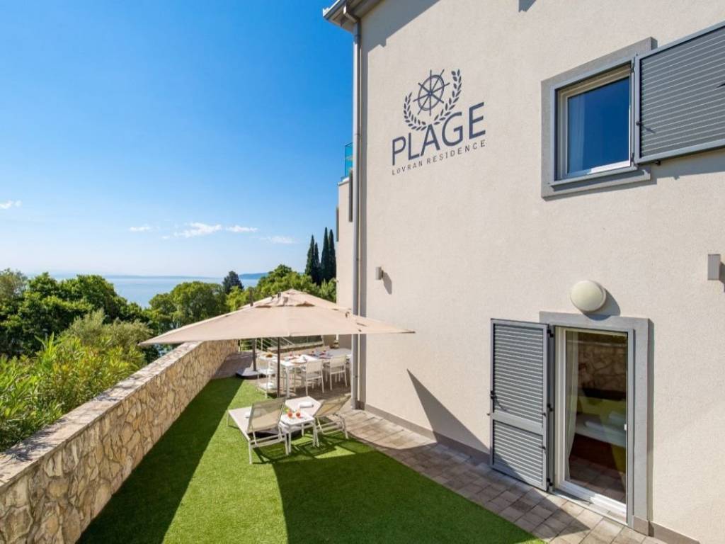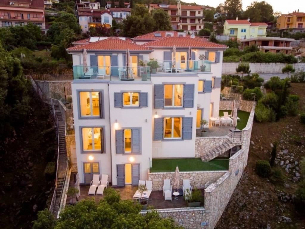Lovran, prodaja ekskluzivnog apartmana površine 94,86 m2, u prizemlju luksuzne vile s pogledom na more i uređenom okućnicom od 96 m2. Apartman se sastoji od dvije spavaće sobe, dnevne sobe s kuhinjom i blagovaonom, kupaonice, toaleta, spremišta, hodnika i terase. Visoko kvalitetna gradnja i oprema, klimatizacija, zajednički unutarnji grijani bazen, parkirno mjesto. Mirna lokacija, 50 m od mora.