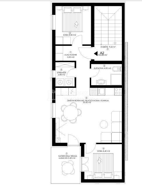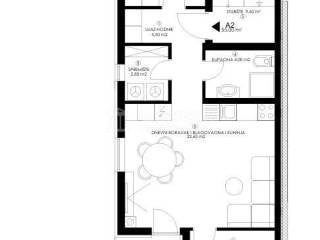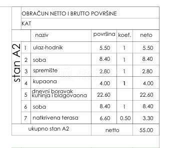 Neto površina 55 m2 +spremište s2(1,12 m2) pm 2(2,50 m2) ukupno 58,62 m2