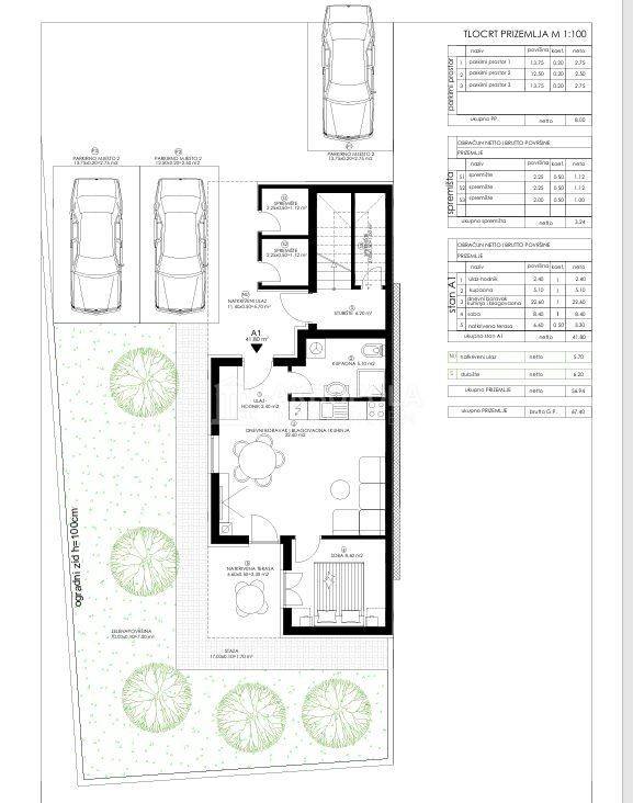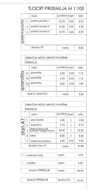 Površina stana 41,80 m2 + spremište 1,12 + vrt 87 m2( 8,70) pm 1( 2,75) Ukupno 54,37 m2