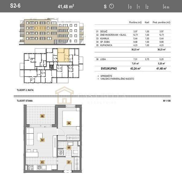 Objekt ima tri kata i ukupno 31 stan. U podrumu se nalaze spremišta, u prizemlju garaže, a uz zgradu vanjska parkirna mjesta.