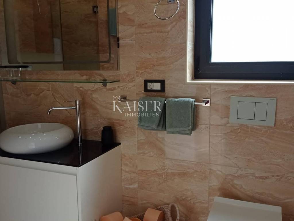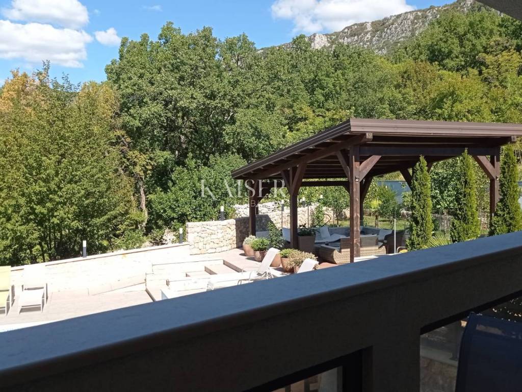 Kaiser Immobilien izdvaja iz svoje ponude prekrasnu luxuznu villu smještenu u zaleđu Crikvenice, samo tri kilometra do mora. Villa je kompletno izgrađena od bračkog kamena, ima unutarnji grijani i vanjski bazen, a sastoji od prizemlja i dva kata, te vrlo ukusno i luksuzno uređena. Prizemlje je osmišljeno kao dnevni prostor sa kuhinjom, blagovaonicom, kupaonicom i prostranim dnevnim boravkom iz kojeg se izlazi na terasu. Na sjevernoj strani prizemlja je smješten grijani bazen. Na prvom katu su smještene tri spavaće sobe sa terasama, tri kupaonice, sauna i kotlovnica. Na drugom katu je smješten jednosobni stan sa terasom. Sistem grijanja su solarni paneli, (za vodu) i dizalice topline na zrak, te klima uredjaji. U sklopu uređene i ograđene okućnice, smješten je vanjski bazen, sunčalište, roštilj, mjesto za druženje i parking za desetak automobila.  Svaka soba ima loggie, s kojih se prostire prekrasan pogled na more, i prekrasnu prirodu. Iznimno kvalitetna gradnja i izvrsnost kuće, smještaju je u top kuće u ponudi.